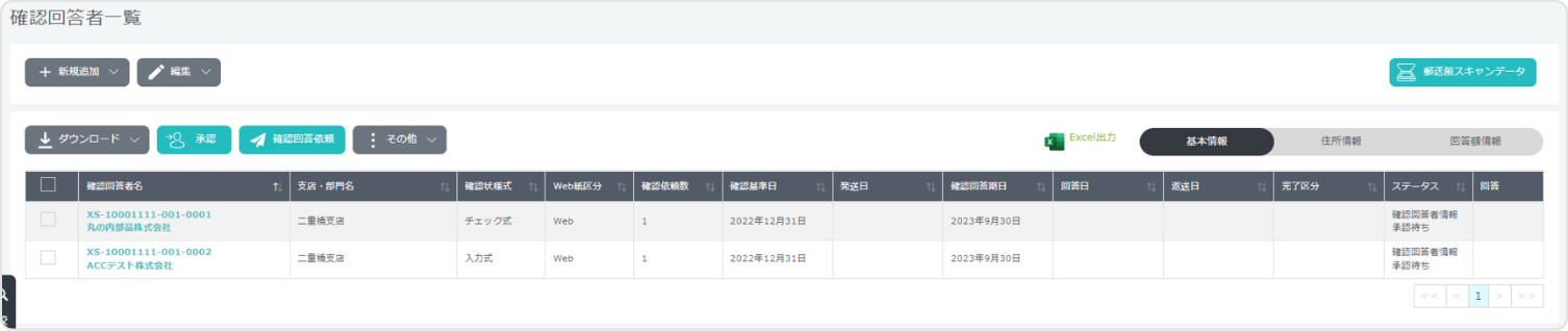 Balance Gatewayの確認回答者一覧画面はExcelファイル形式で、受領した回答はPDFファイル形式で出力でき、監査調書としてご利用いただけます。ペーパーレス化により紙面紛失のリスクもなくなります。