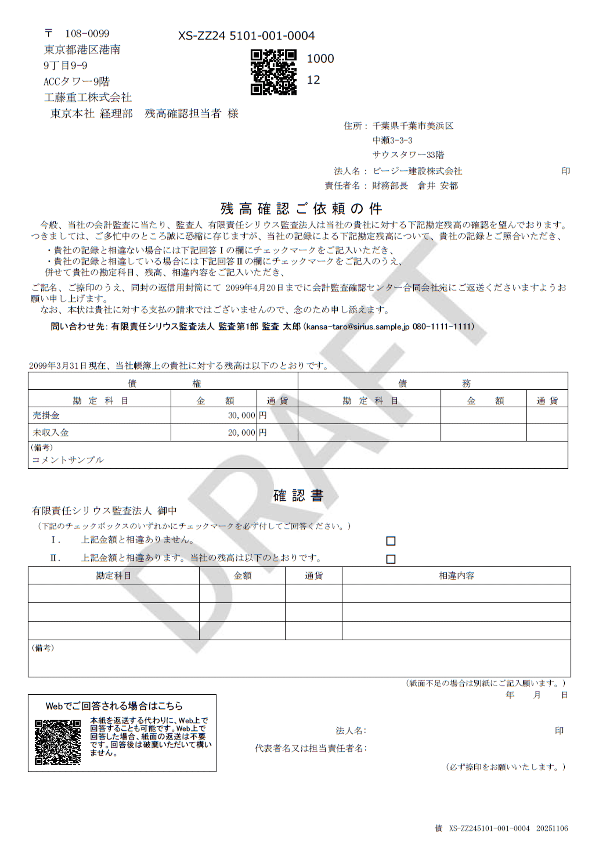 - Web確認を行う際に送付される確認依頼書について、確認回答者の法人/個人区分が個人の場合に、個人情報の取り扱いのメッセージが出力されるようになりました。