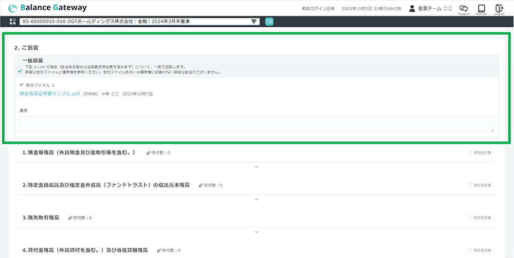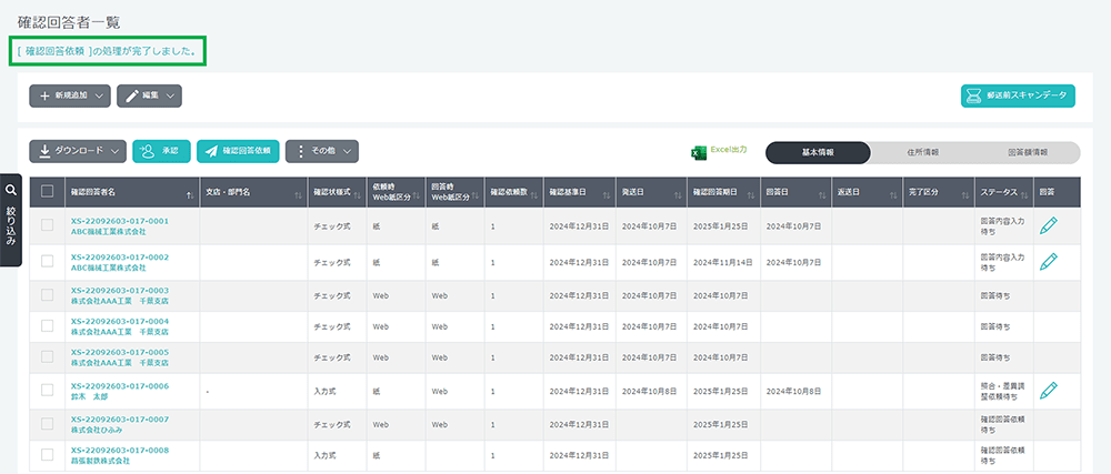 バージョンアップ以前は「確認回答者情報の追加」を実施してから「残高情報の登録」を実施していましたが、バージョンアップにより確認回答者情報追加用のExcelファイルの項目が変更となり、「確認回答者情報の追加」時に残高データも登録することが可能となります。項目の詳細はマニュアルを参照ください。