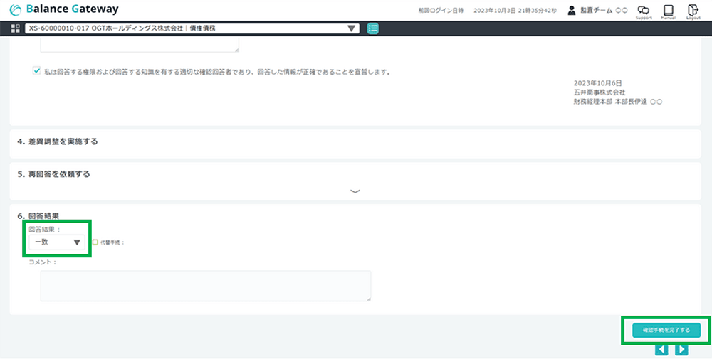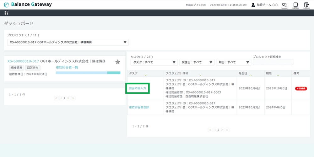 - プロジェクトタイプ「債権債務」における確認回答者ユーザーによる差異調整画面も利用状況を鑑み廃止しております。差異調整画面は監査人ユーザーおよび被監査会社ユーザーのみとなります。