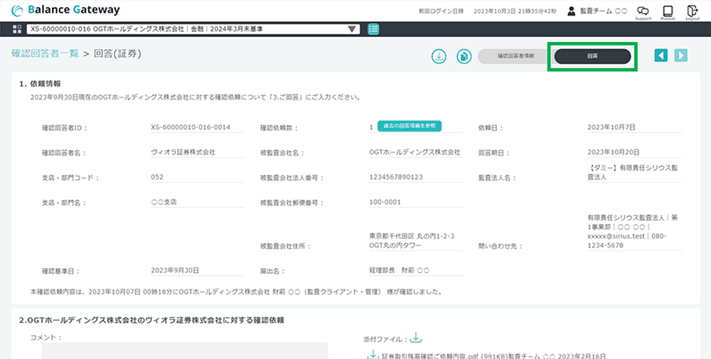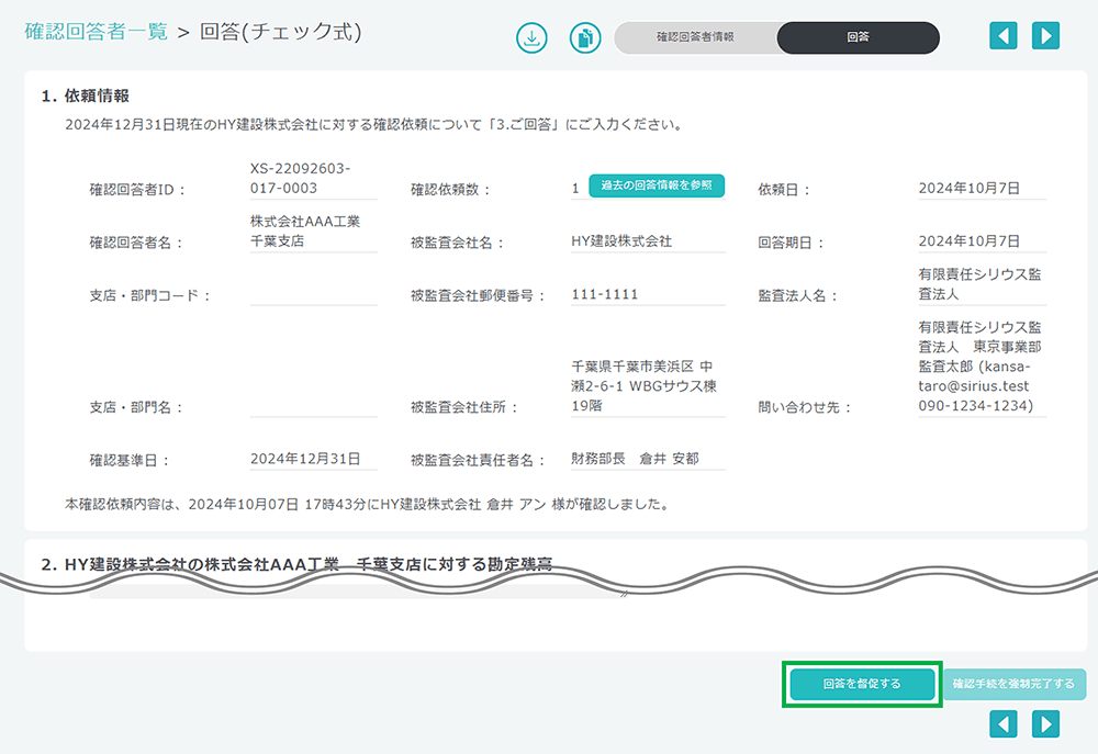 [確認回答者情報]画面に表示されている「この確認回答者情報を複写する」ボタンが追加されており、監査人ユーザーおよび被監査会社ユーザーは、既存の確認回答者情報をコピーして利用することが可能です。