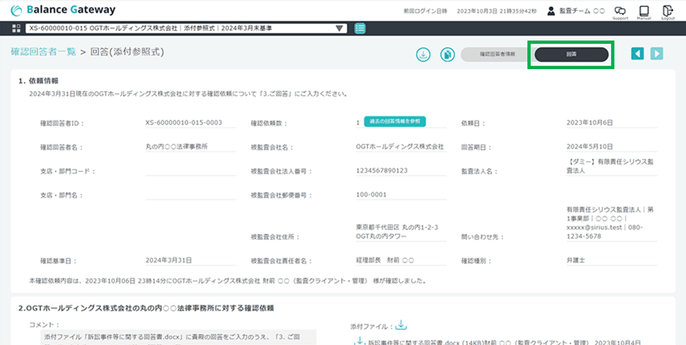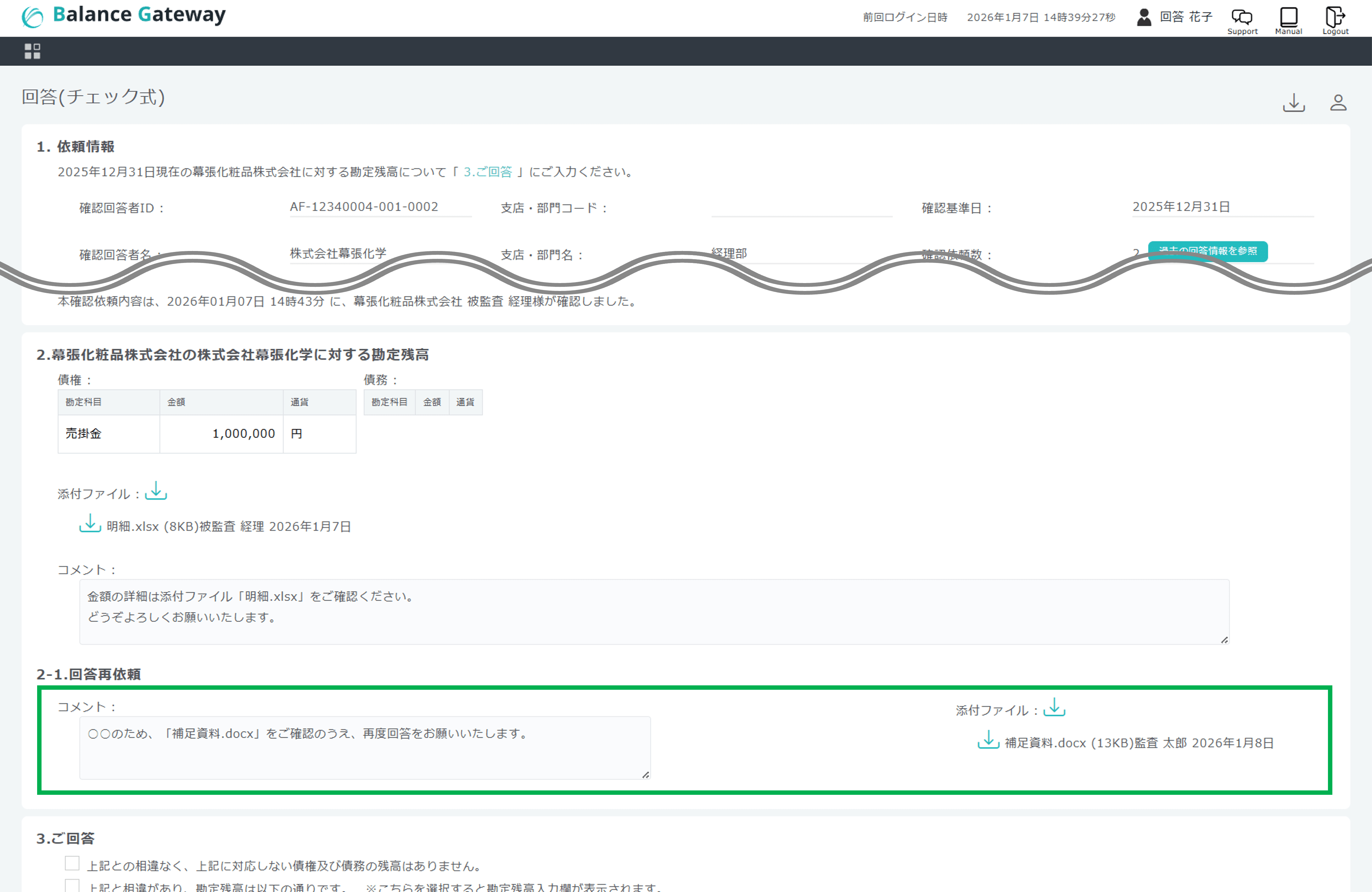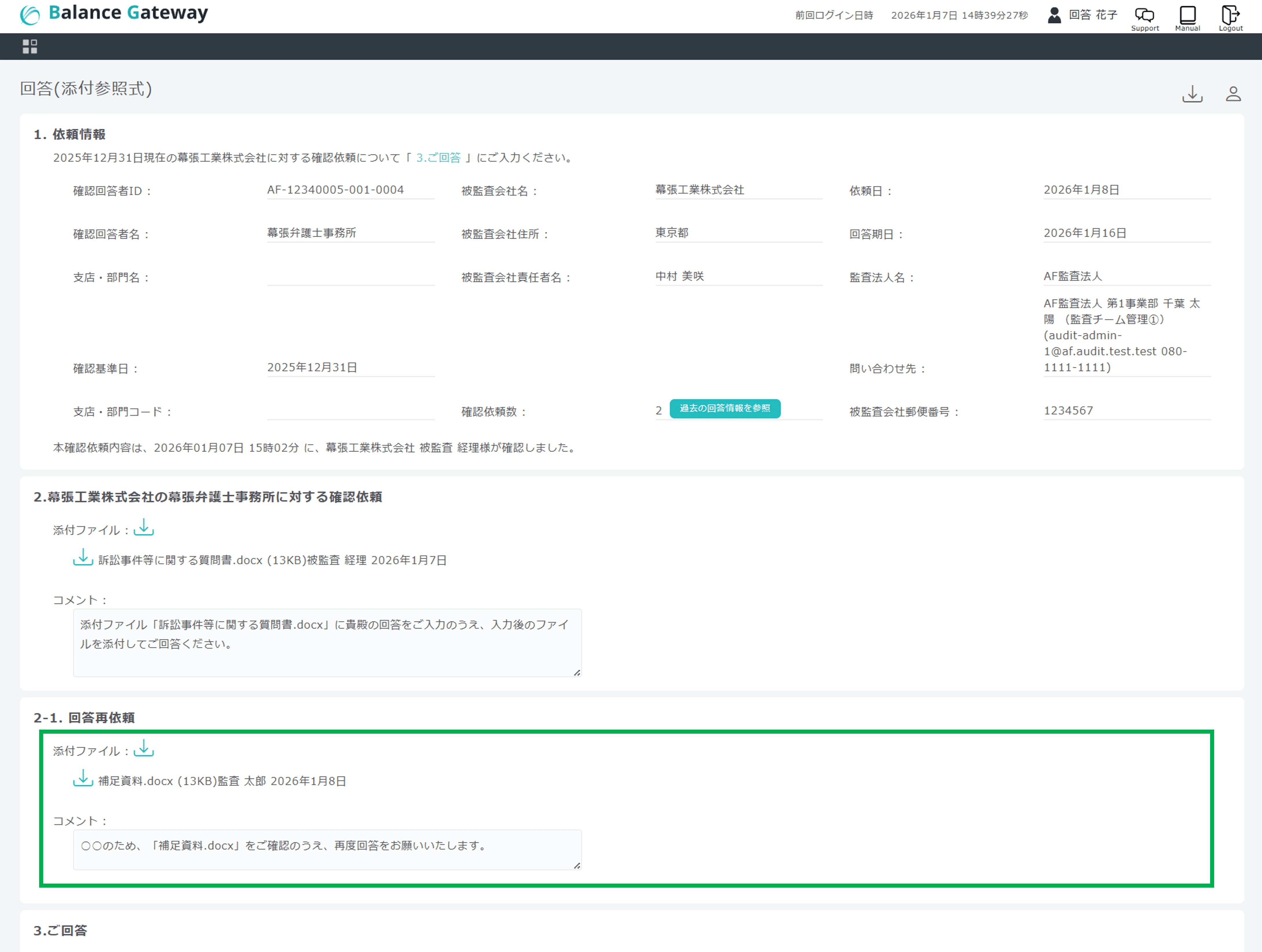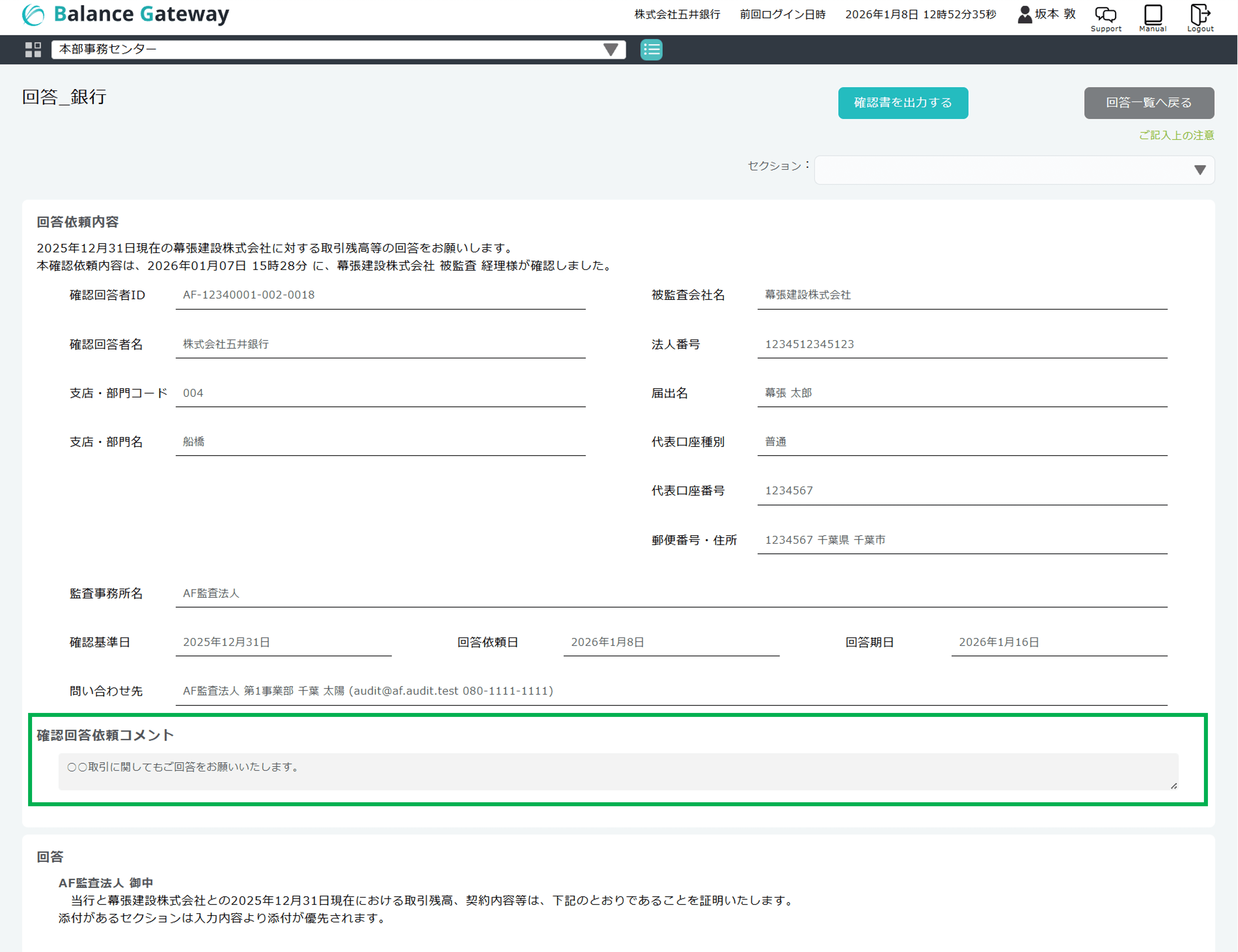 プロジェクトタイプ「債権・債務」(旧:プロジェクトタイプA)のチェック式の場合、バージョンアップ前は[回答]画面の[監査クライアント備考]欄にコメントを入力しても紙面確認状には反映されませんでしたが、バージョンアップによりコメントが紙面確認状に反映されます。