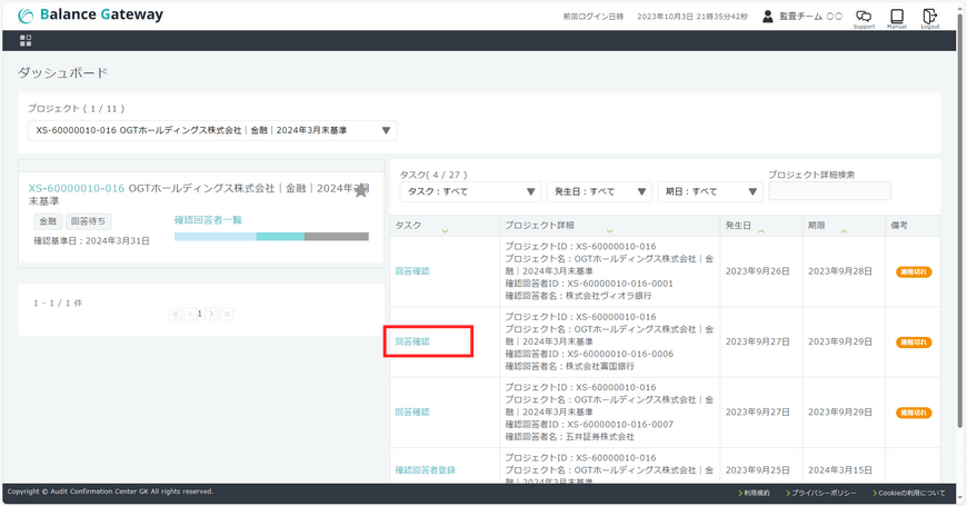 - 確認回答者ステータスとタスク一覧