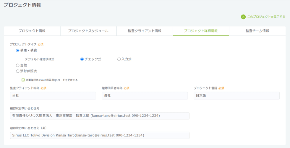 - プロジェクトタイプ「金融」において、「支店名」の項目を必須項目から任意項目に変更しました。なお、従前どおり「支店名」の項目に入力された項目は紙面の確認状に記載されませんので、「宛名」の項目に支店名を入力ください。