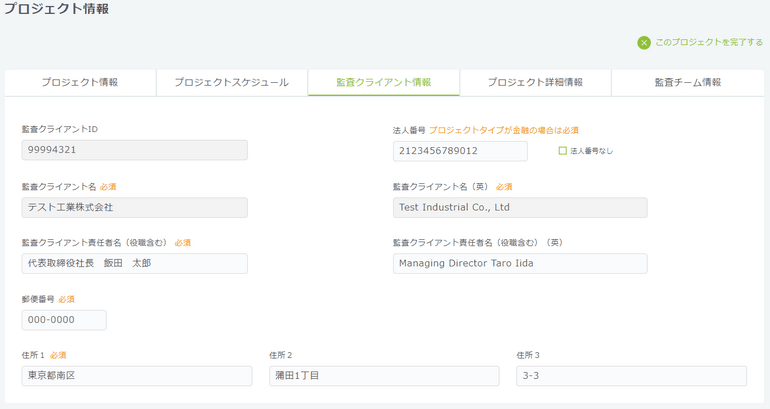 - プロジェクト情報の監査クライアント情報タブに[法人番号]欄を追加しました。監査クライアントの法人番号を入力する欄です。こちらは今後の実装予定の追加機能を利用する際の項目となります。