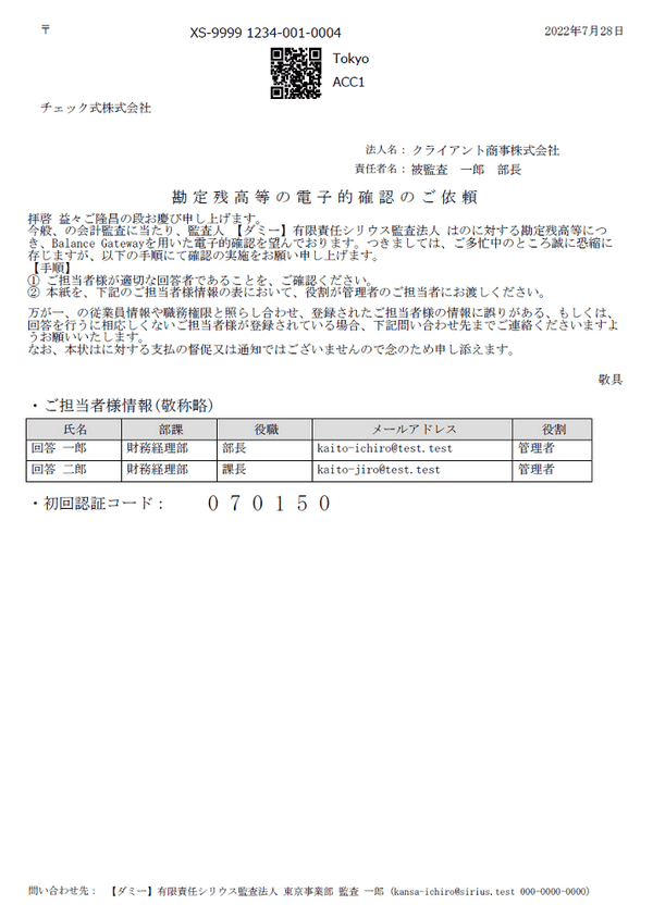 Web確認時に、確認回答者が初回認証を行う際に必要な確認コードを確認回答者の管理者へメールする方法に変更し、従来、紙面で発送していた確認依頼書は廃止しました。