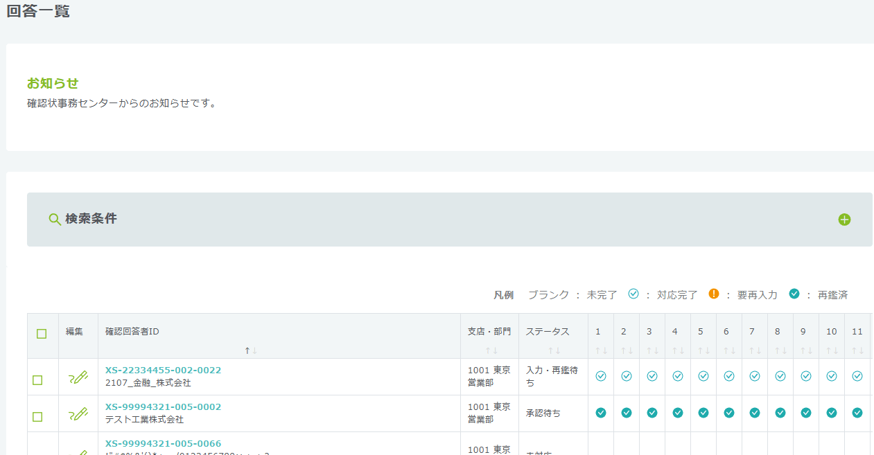 - 【金融・銀行等】 認証済回答者(銀行等)が回答中に監査チームユーザーが[確認回答者情報]画面で確認手続の強制完了操作をできてしまう(銀行等が回答手続を続けられなくなる)不具合を修正しました。
