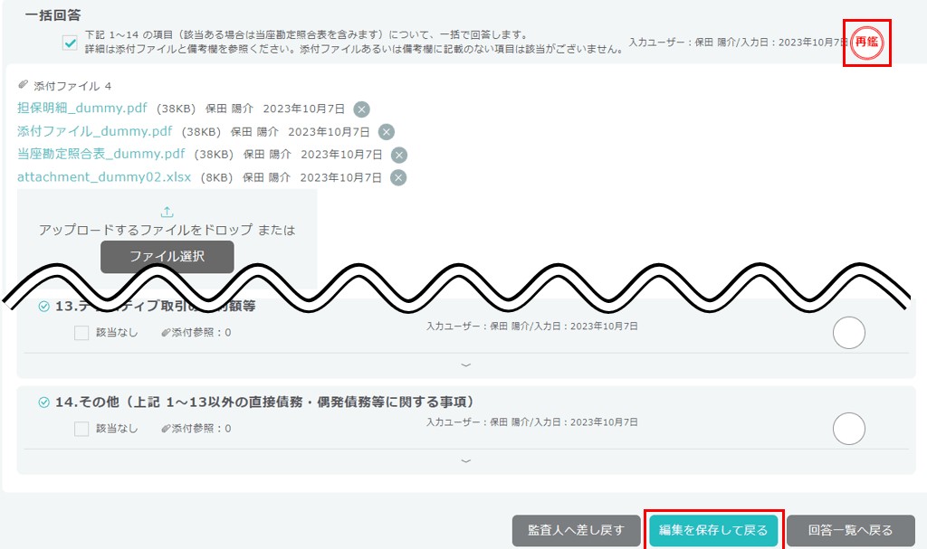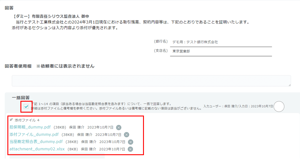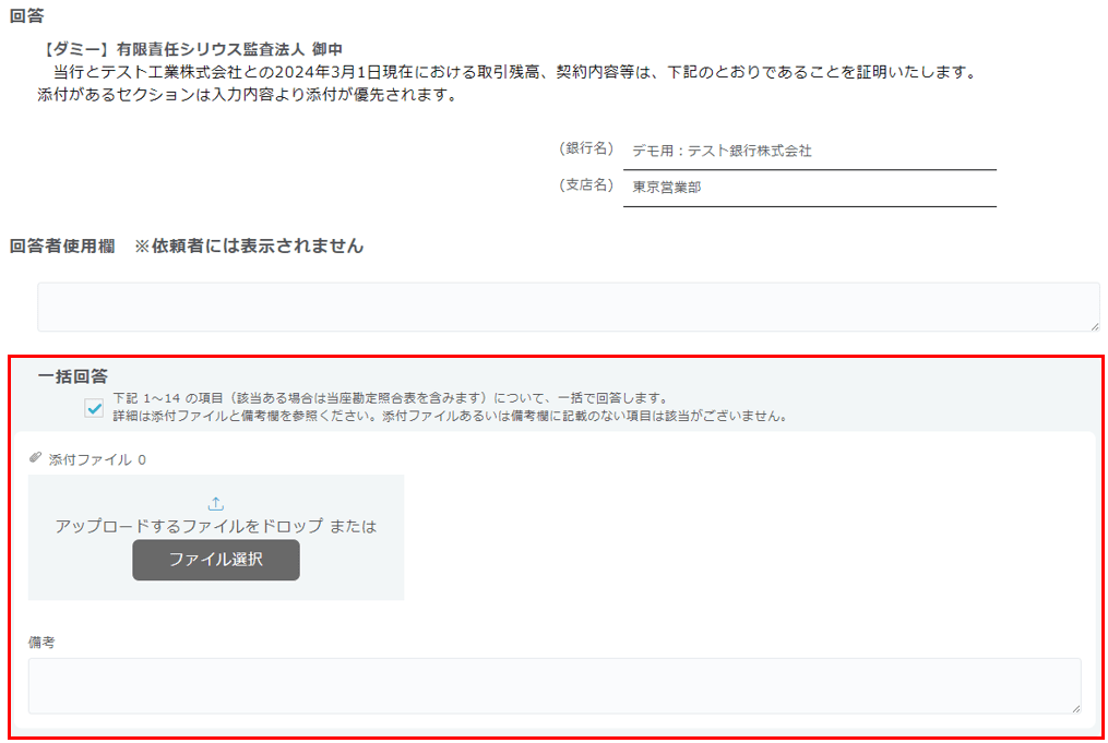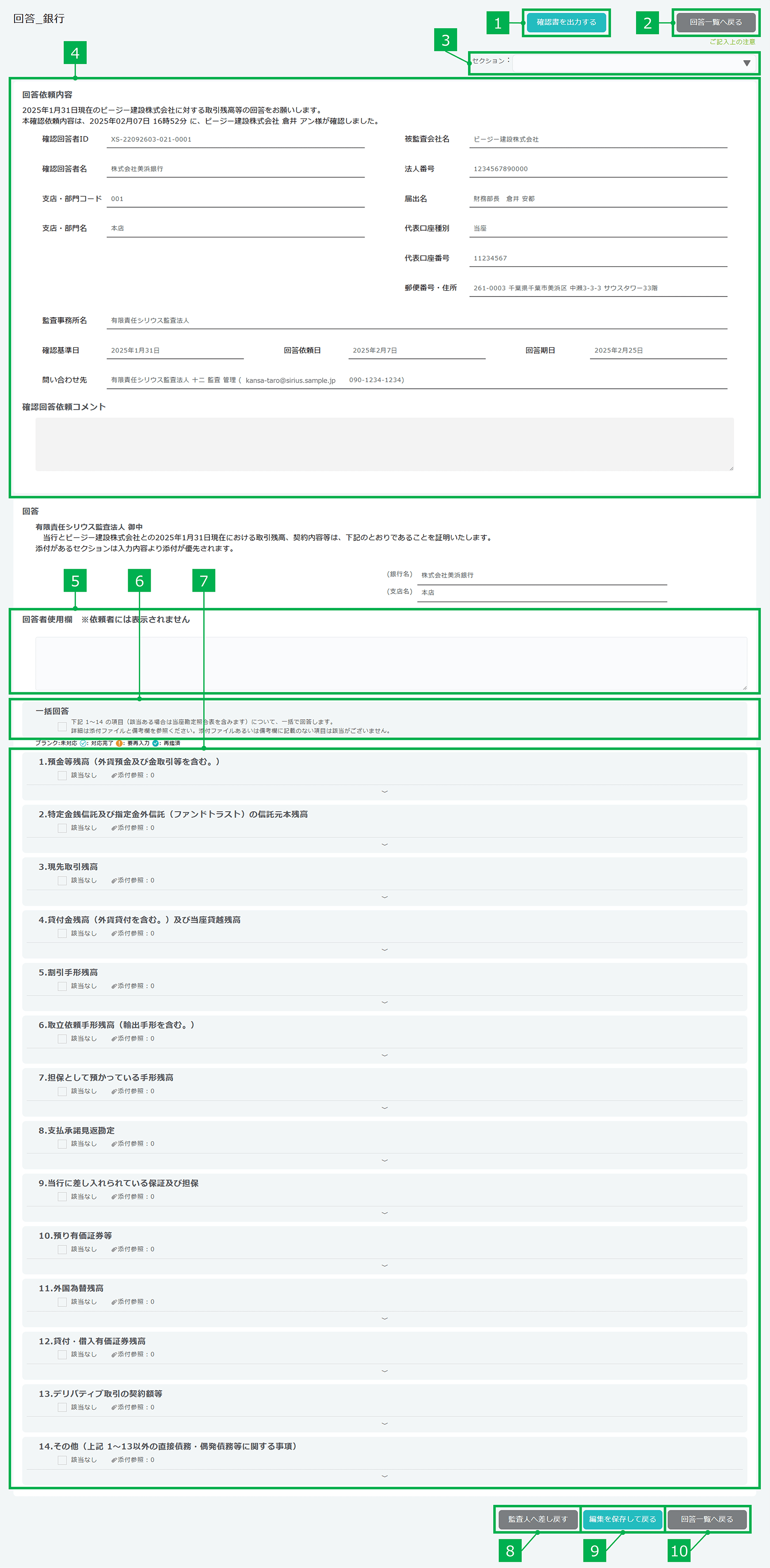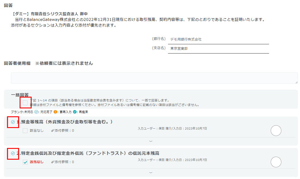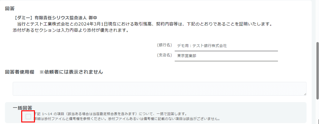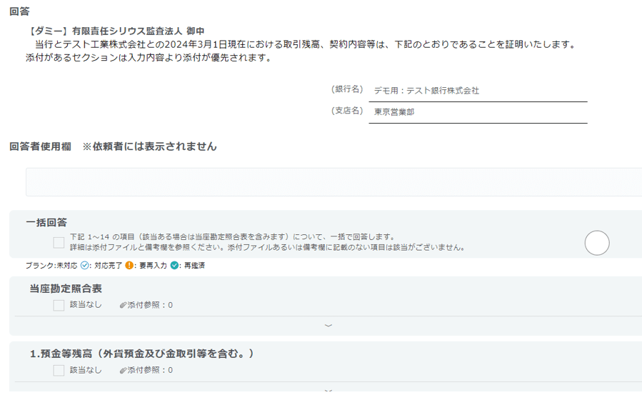 銀行取引残高確認の回答画面に一括回答欄を追加しました。一括回答を選択した場合、1.~14.の各回答項目、当座勘定照合表への回答入力・再鑑が不要です。