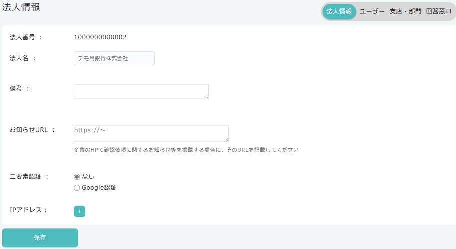 認証済回答者の法人名の変更などのほか、Google Authenticator/Microsoft Authenticatorを利用したワンタイムパスワードの利用の有無や、接続元IPアドレスの制限などのセキュリティ関連の設定ができます。
