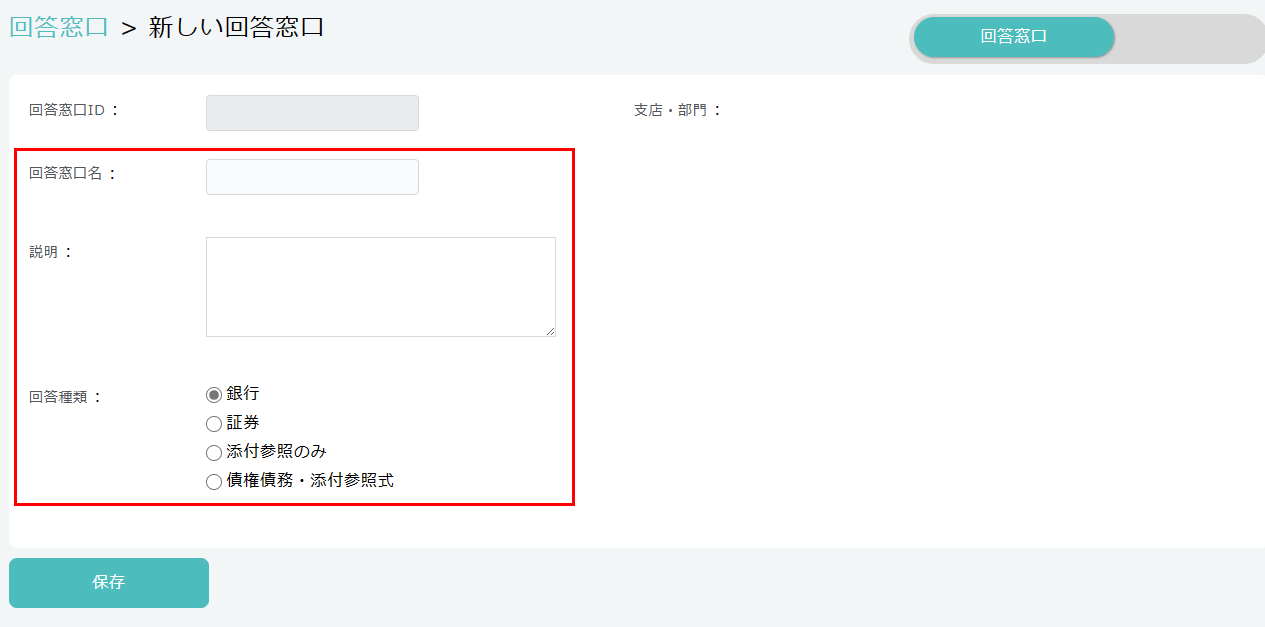 認証済回答者における回答単位となる[回答窓口]を作成します。この後設定する[支店・部門]および[ユーザー]をそれぞれ[回答窓口]に紐づけることで、[支店・部門]に送付された回答依頼(確認状)を、[ユーザー]が回答できるようになります。設定イメージは、ユーザーの役割と権限ページの「回答窓口、支店・部門とユーザーの関係」を参照してください。