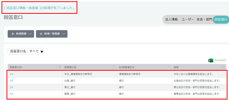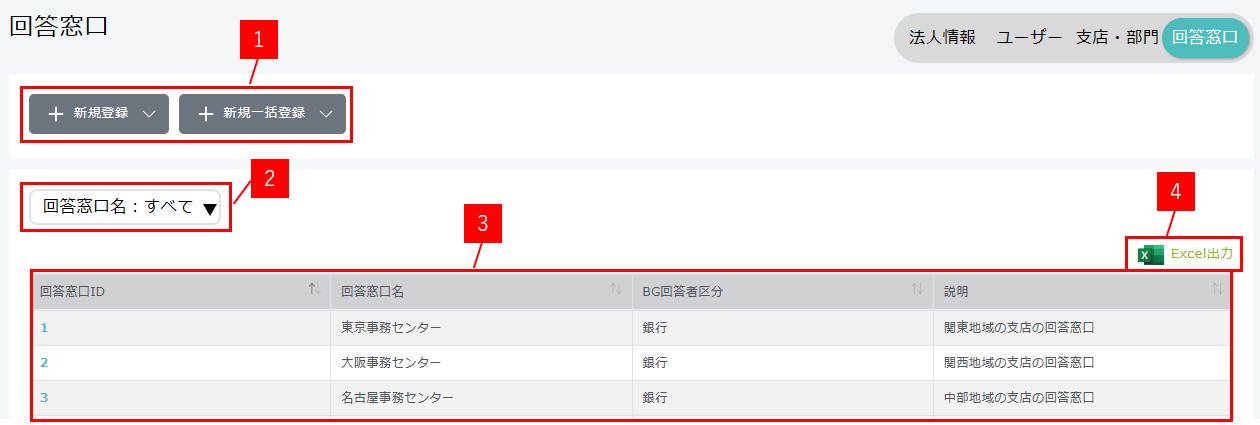 - 法人ユーザーの登録と編集、回答窓口への紐づけ