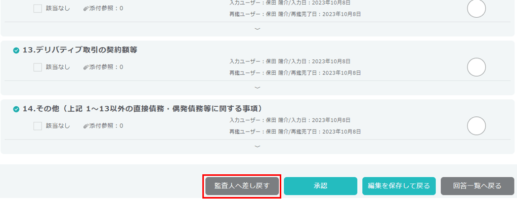 - 銀行等取引残高確認において、監査チームユーザーが確認手続の強制完了を戻した際に、確認項目すべての再鑑が済んでいない場合でもステータスが[承認待ち]と表示される不具合を修正しました。
