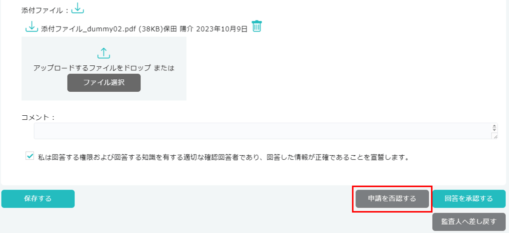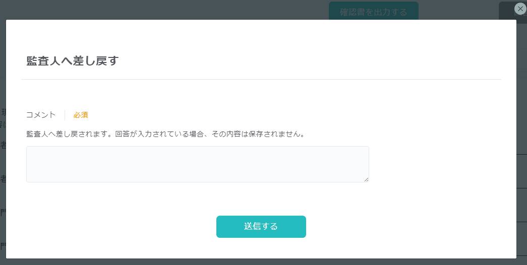 回答差戻しの理由等を監査人が確認し、スムーズに再回答依頼等をできるよう、回答差戻時のコメント入力を必須化します。
