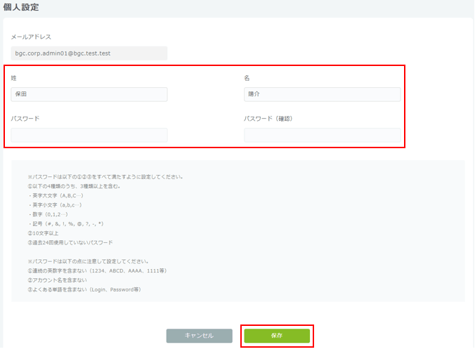 初回ログイン時は、利用登録メールに記載されたパスワードを用いてログインすると、パスワード変更画面に遷移します。[パスワードを変更する]ボタンをクリックし、任意のパスワードを設定します。