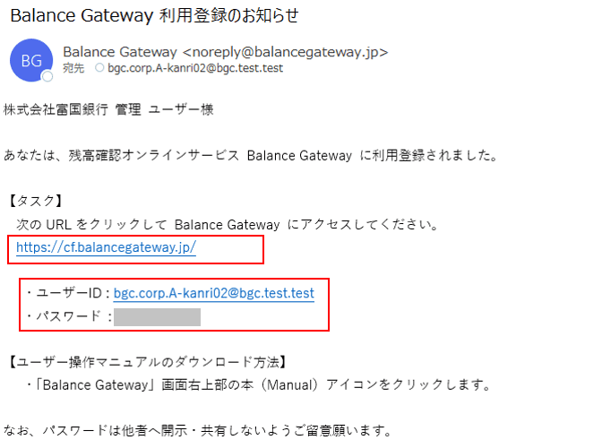 Balance Gatewayへの最終ログインが2024年6月以降で、監査チームによる確認手続がまだ完了していないユーザーの方には、2024年8月31日(土)にBalance Gateway(送信者:noreply@balancegateway.jp)からパスワード再設定のためのメール(件名:「Balance Gateway 仮パスワードのお知らせ」)が送信されますので、メールに記載された仮パスワードからご自身のパスワードへのご変更をお願いします。