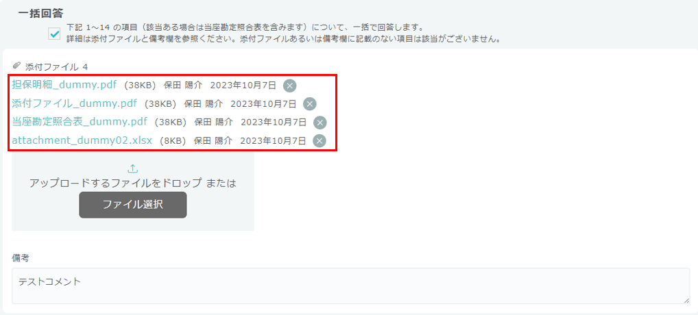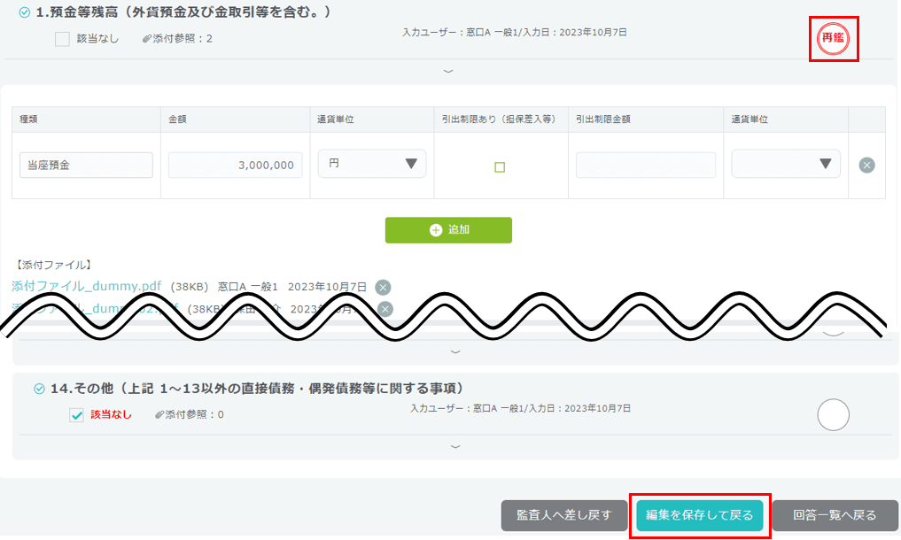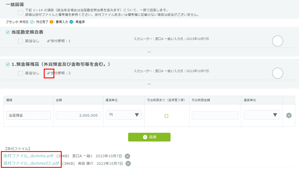 - 銀行等取引残高の回答において、一度添付したファイルを削除した場合にステータスが[入力・再鑑待ち]から[未対応]に戻らない不具合を修正しました。