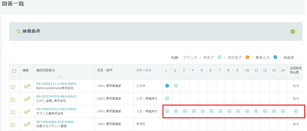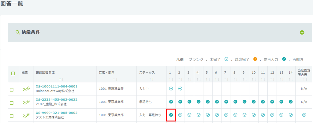 Balance Gateway v.7.0では、回答一覧にステータス「強制完了」として表示させるとともに、CSV出力も可能になります。なお、回答依頼の詳細等は参照できない設計です。