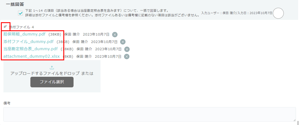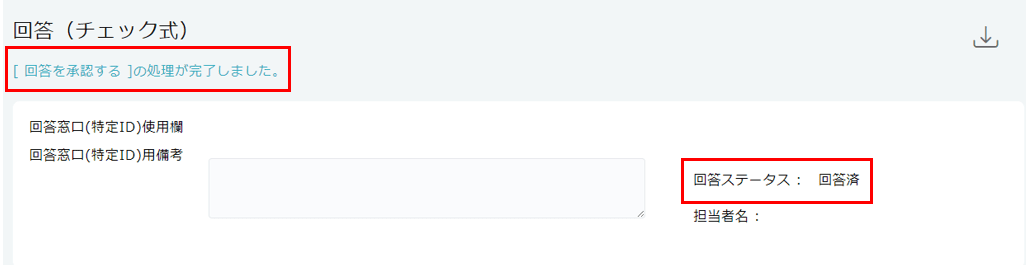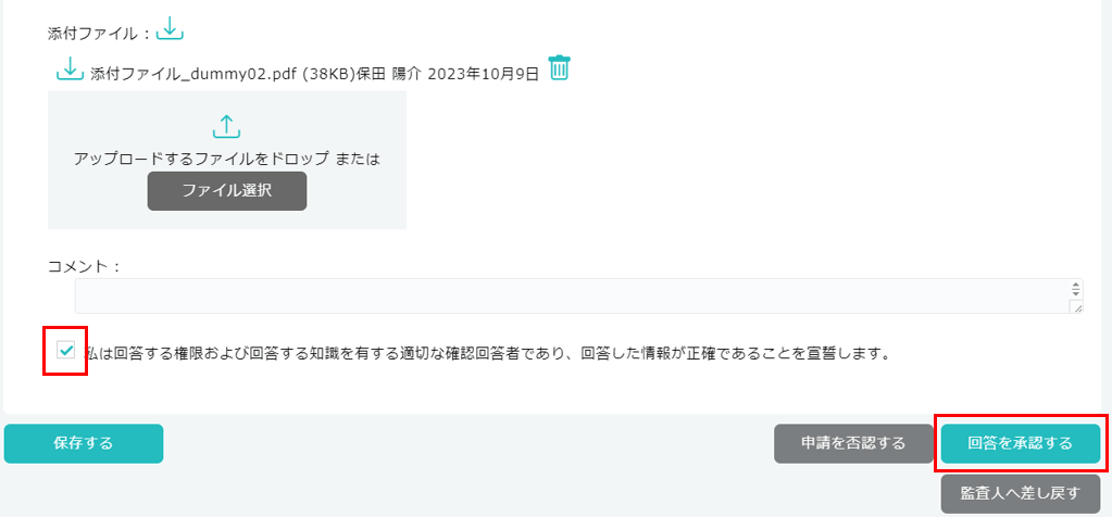 - 回答に添付ファイルがある場合、宣誓時にダウンロードを要求する仕様に変更しました。これにより、宣誓後に[回答一覧]画面で一括承認する際、[回答]画面に戻り添付ファイルをダウンロードし直す必要がなくなりました。