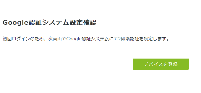 Balance Gatewayにはじめてログインする際に、下図[Google認証システム設定確認]の画面が表示されたら、「Google Authenticator/Microsoft Authenticator 利用開始方法(PDF)」を参照し、Google認証システムを設定するデバイスを登録してください。