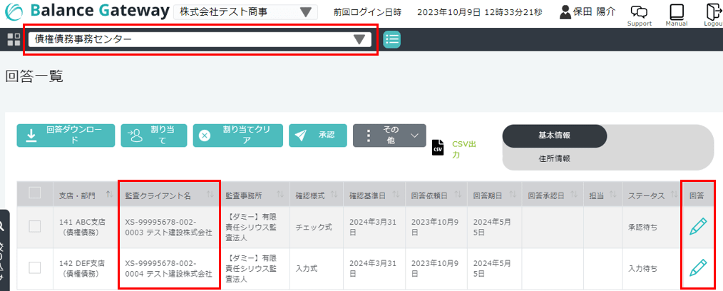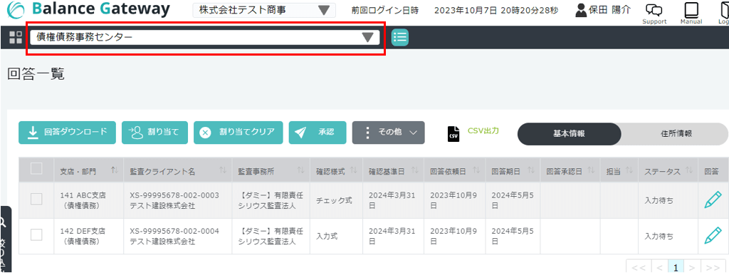 こちらの設定により回答窓口が作成され、それに支店・部門およびユーザーが紐づけられると、監査人は確認回答依頼ができるようになります。