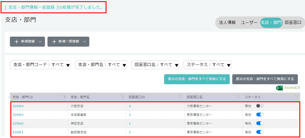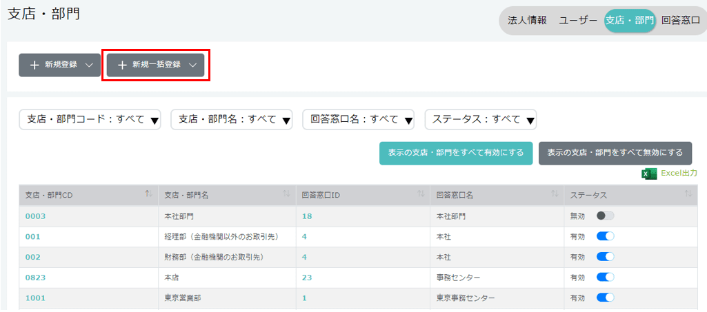 - 支店・部門の登録と編集、回答窓口への紐づけ