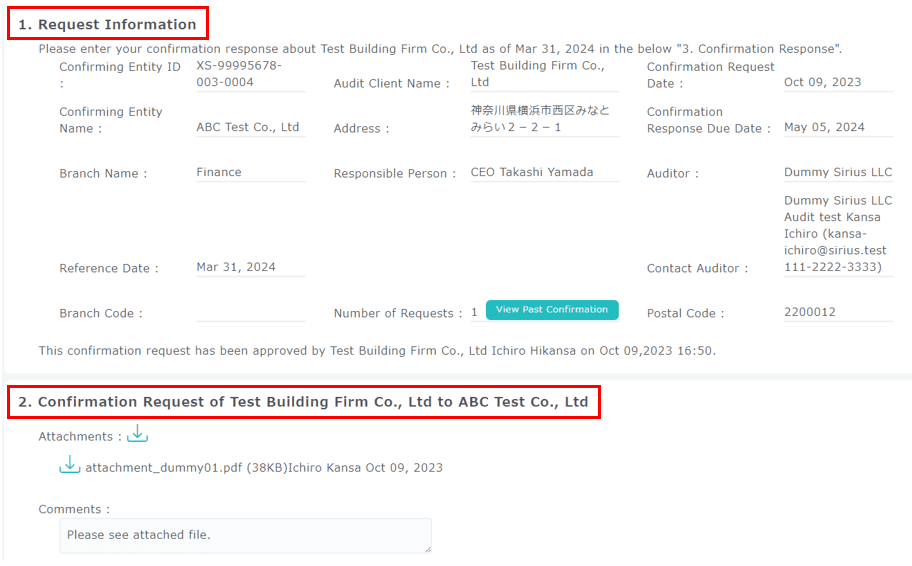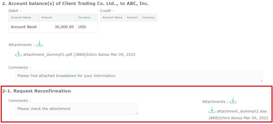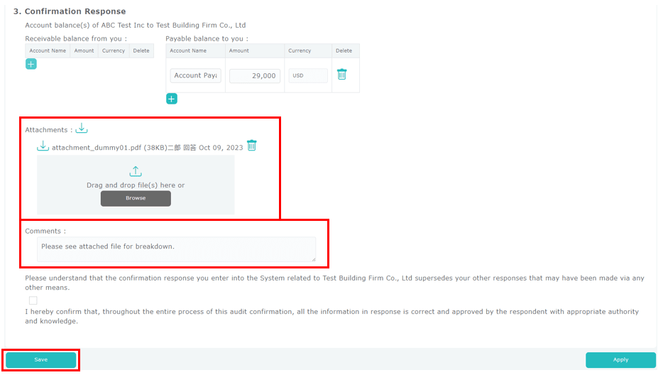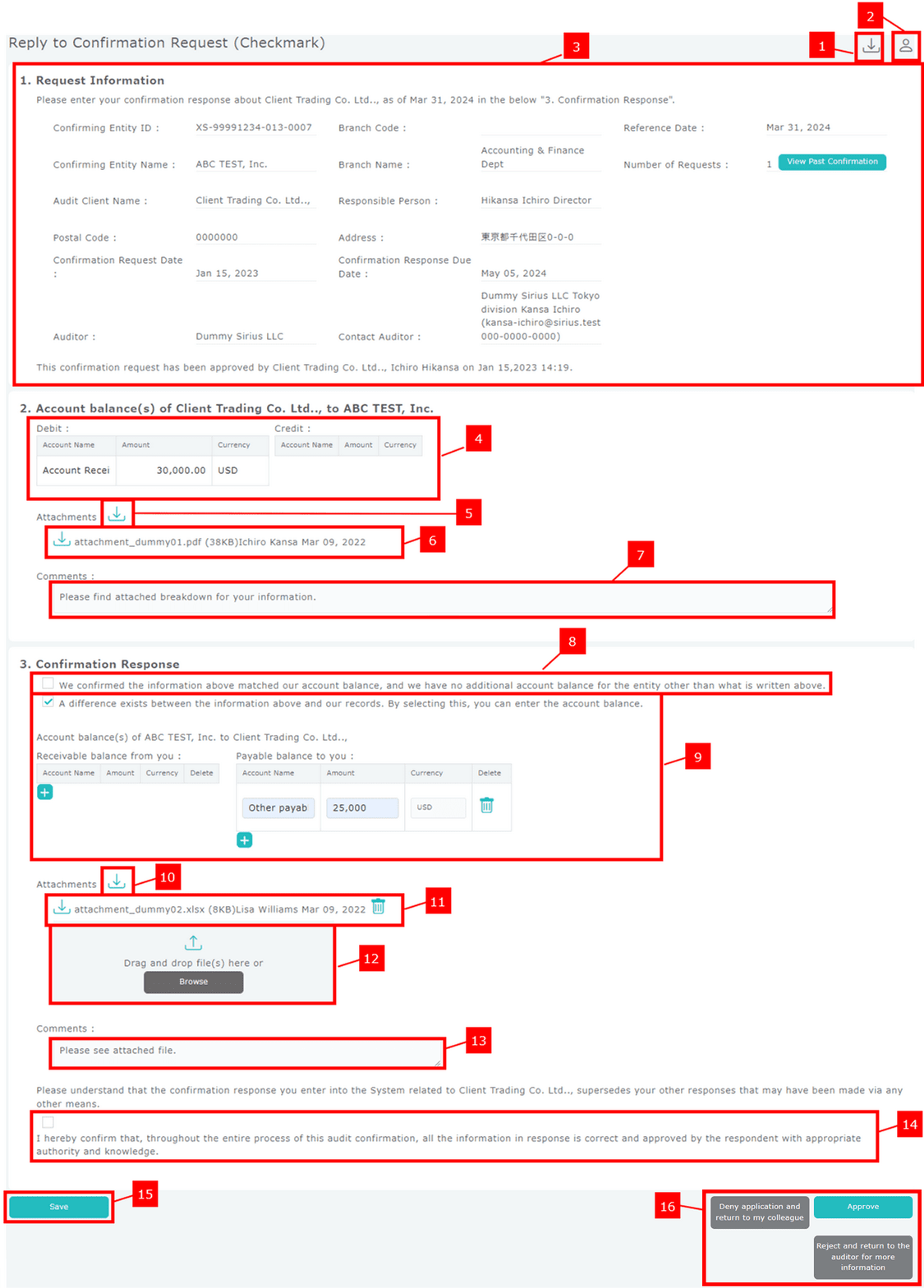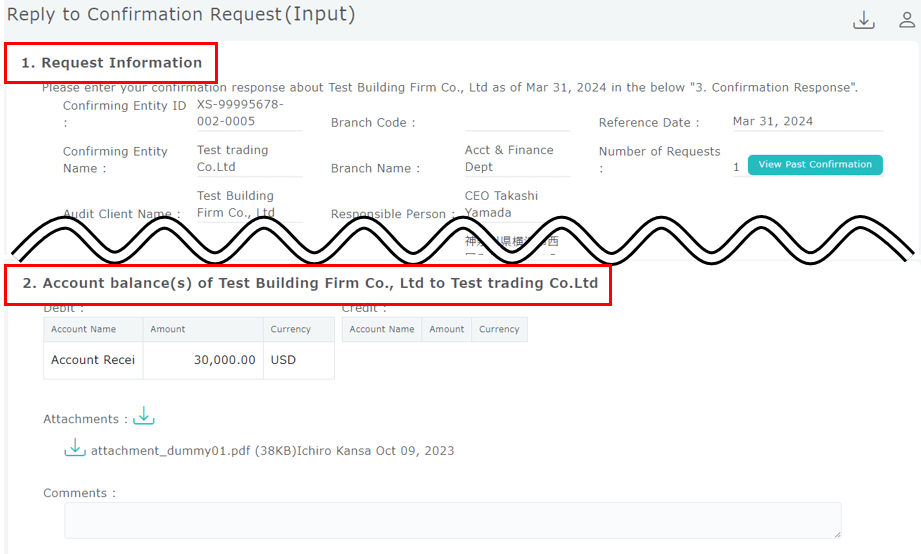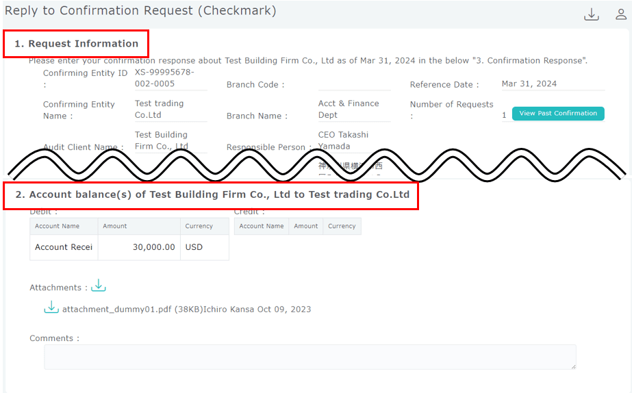If the response request includes an attachment, you can click the attachment of [2. Account balance(s) of <<audited company name>> to <<your company name>>] () to download it.