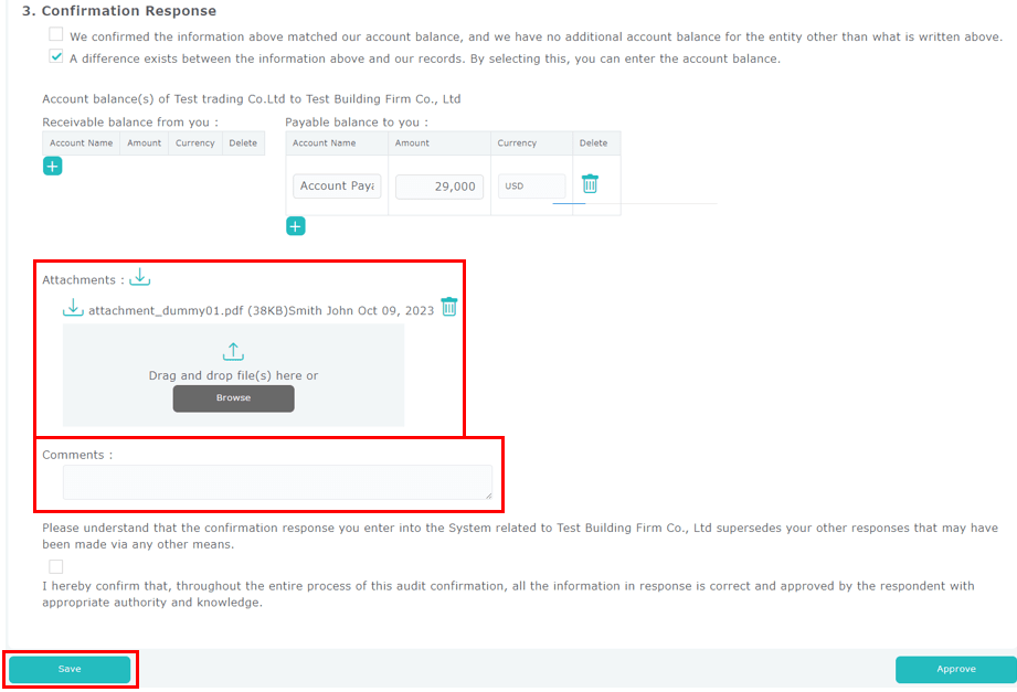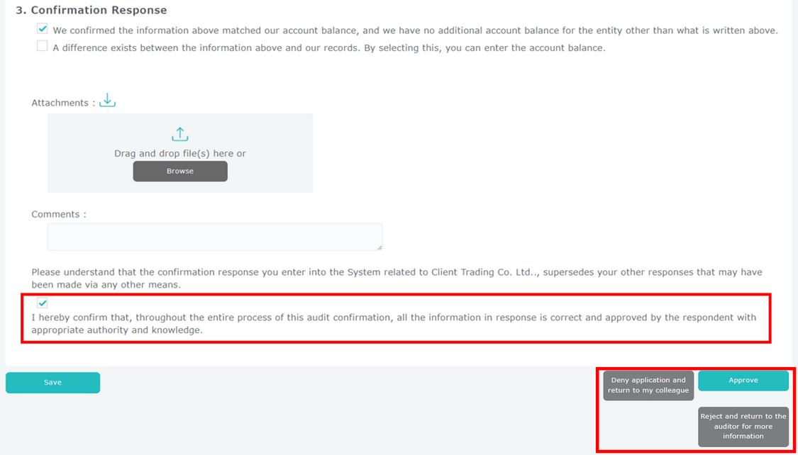 Select [We confirmed the information above matched our account balance, and we have no additional account balance for the entity other than what is written above.] checkbox.