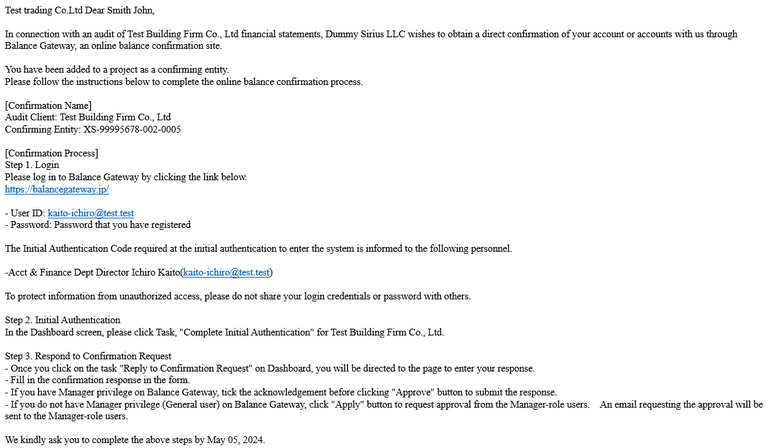 When a response request for Web confirmation is issued by the auditor, or when user registration is completed through the QR code printed on the paper-based confirmation document, the following e-mail will be sent to the confirmation respondent users (you).