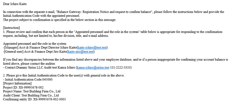 Should you have any questions about the contents of the confirmation request, registration data, attached file(s), etc., please do not hesitate to contact the auditor mentioned in the Initial Authentication Code notification email.