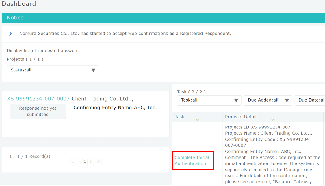 Complete initial authentication for each confirmation request. Displays the [Dashboard] screen. Click the [Complete Initial Authentication] link from the task list on the right side of the screen.