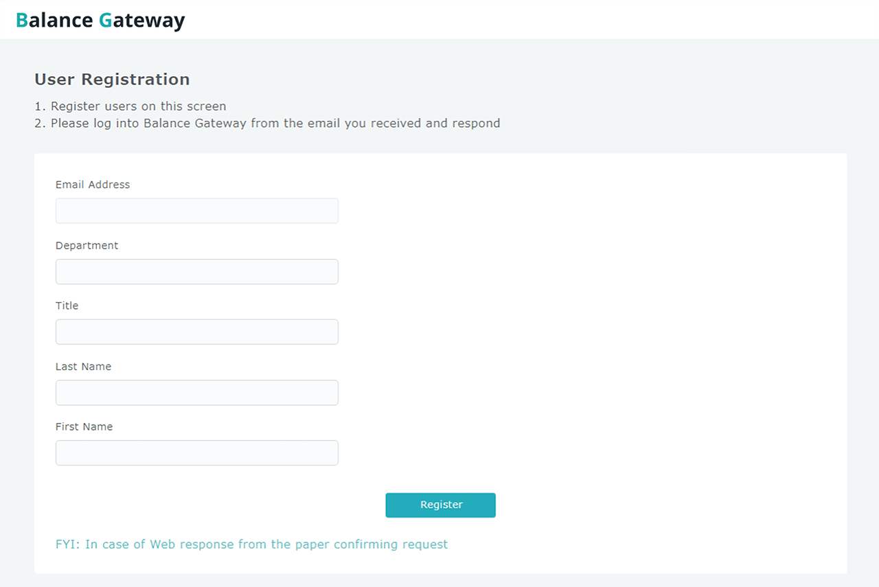 Enter the user information for registration on Balance Gateway ([Email Address], [Department], [Title], [Last Name], and [First Name]), and click the [Register] button.