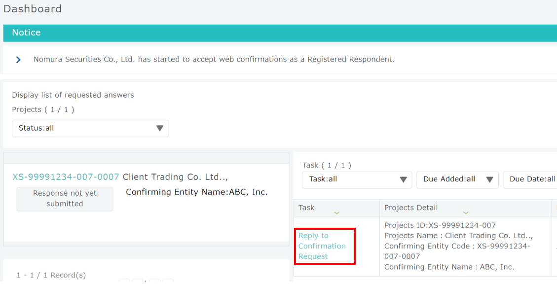 Click [Reply to Confirmation Request] link indicated in the task to display [Reply to Confirmation Request] screen.