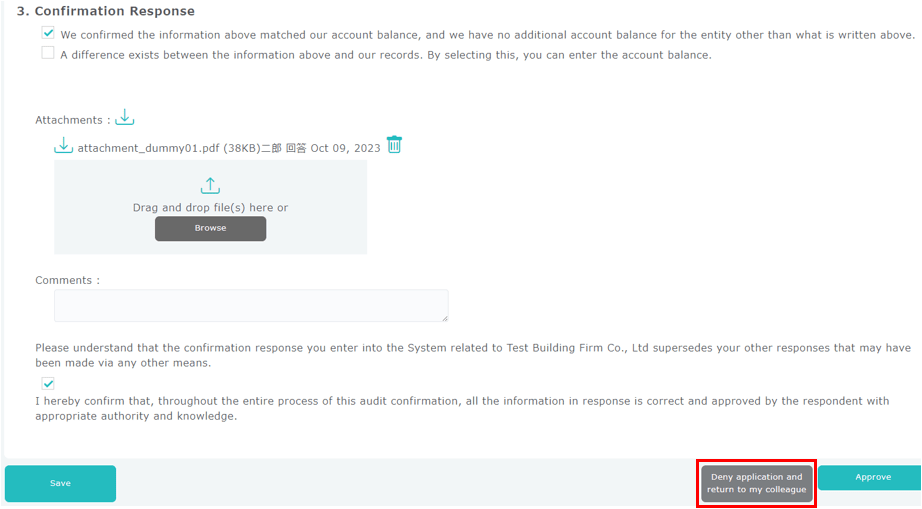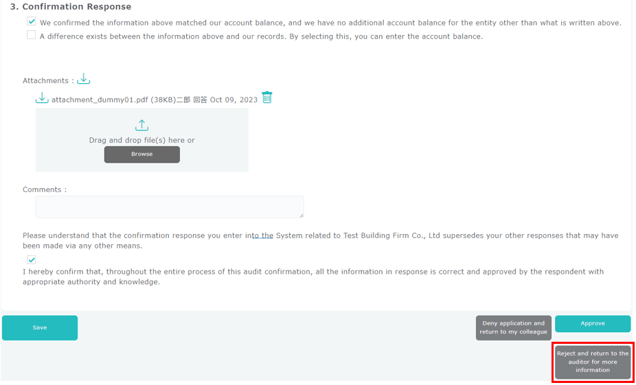 To attach a file, drop the file into “Drag and drop file(s) here” field in [3. Confirmation Response], or click the [Browse] button at the bottom of the screen and select the file.