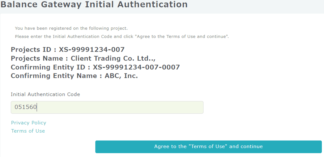 When “Balance Gateway Initial Authentication” screen appears please enter the Initial Authentication Code described in “RECEIVE USER REGISTRATION EMAIL AND INITIAL AUTHENTICATION CODE” and click [Agree to the “Terms of Use” and continue] button to complete the initial authentication. Then, [Complete Initial Authentication] task is no longer indicated in “Dashboard” screen.