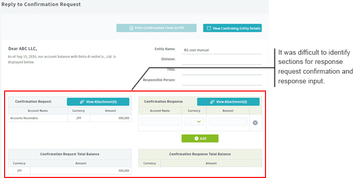 The [Reply to Confirmation Request] screen is divided into three main sections from the top.