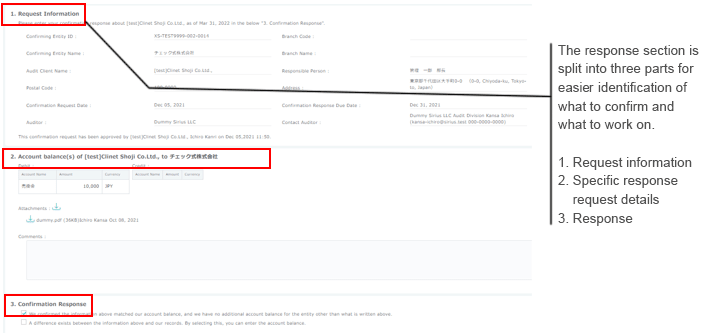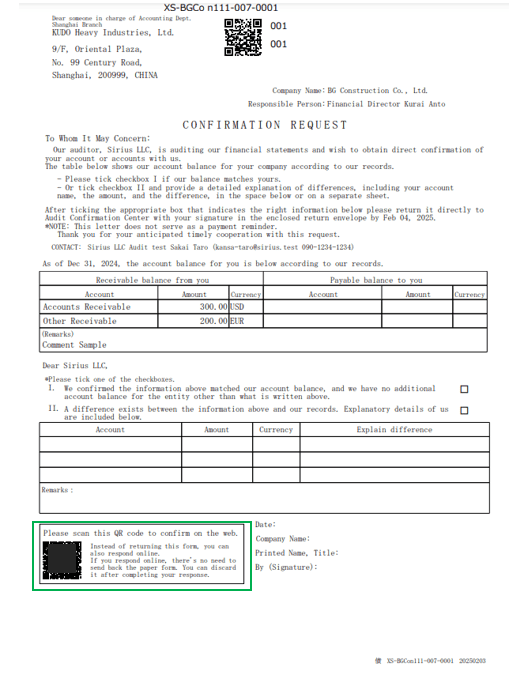 - In the paper-based confirmation document of the balance of receivables and payables, if the audit team selects the option to include a QR code for web responses, the confirmation respondent can now reply online. Responses can also be provided on paper, as was done previously.