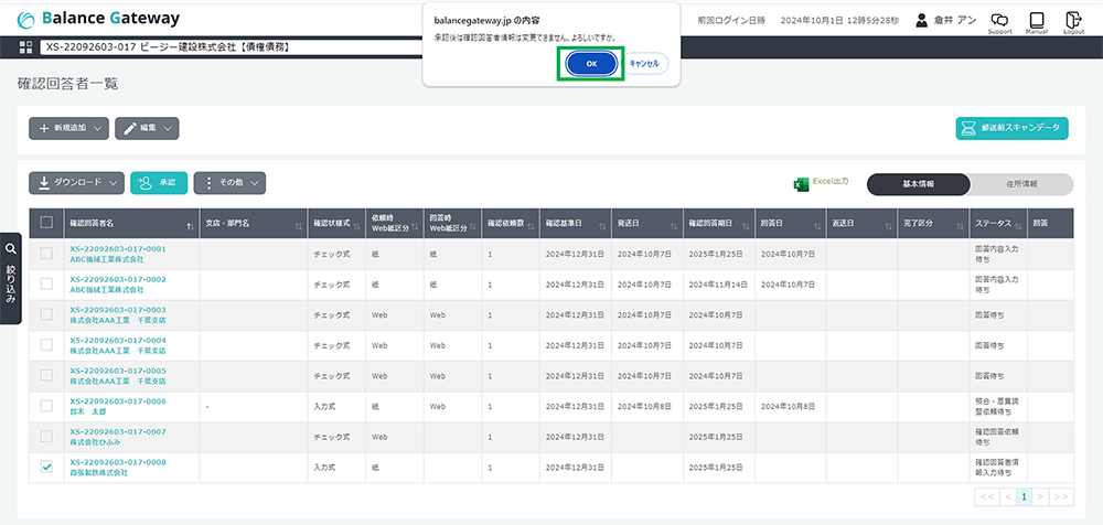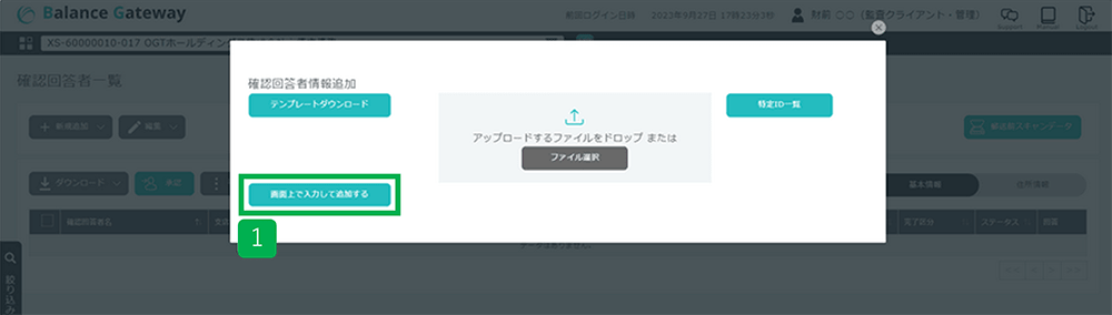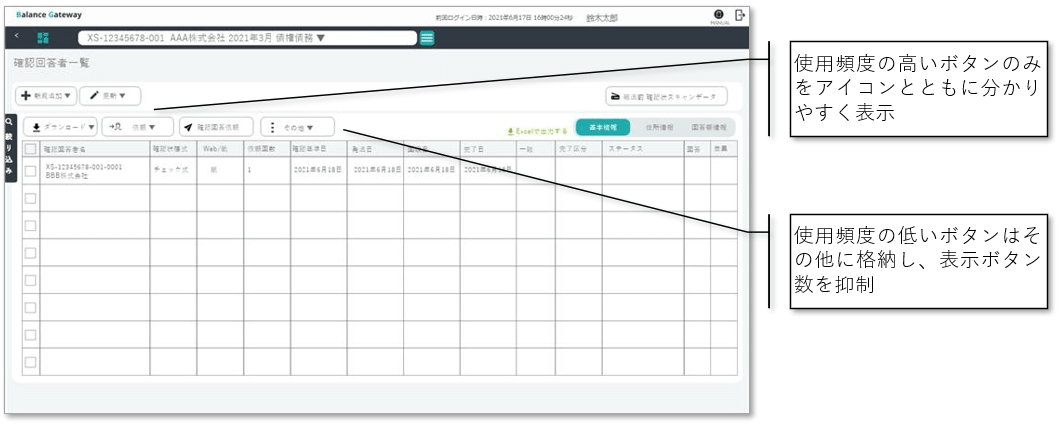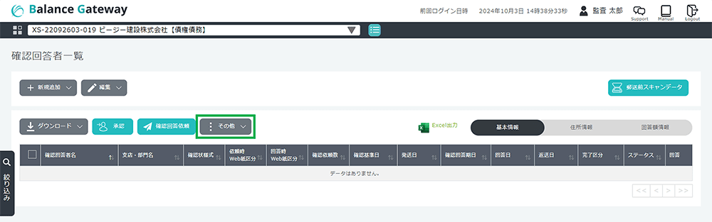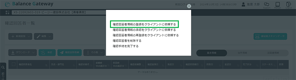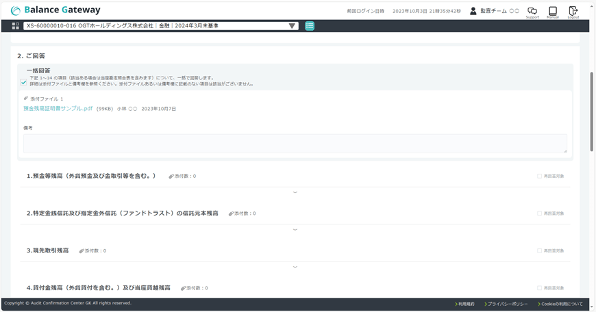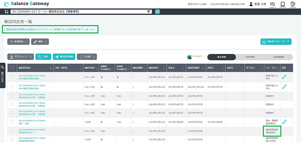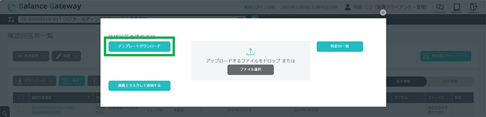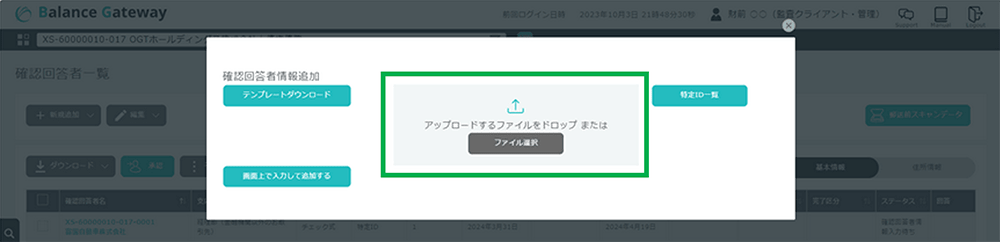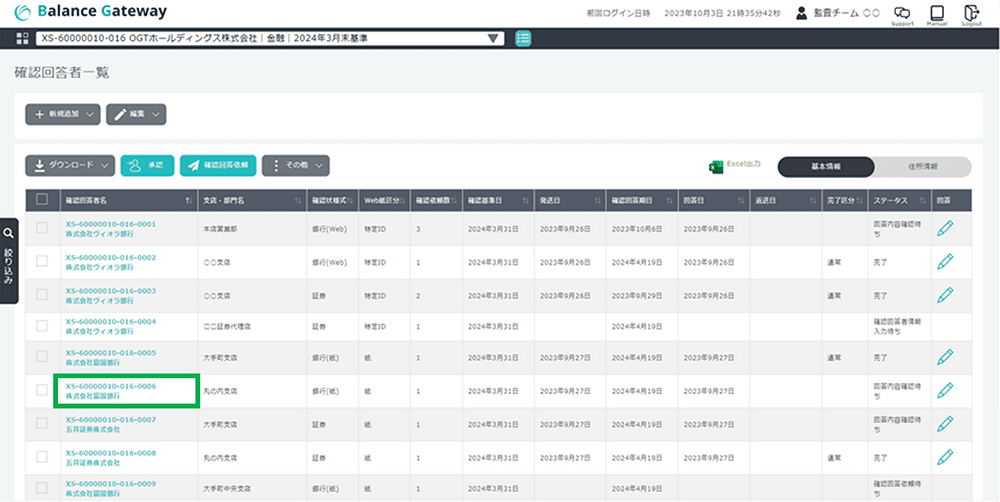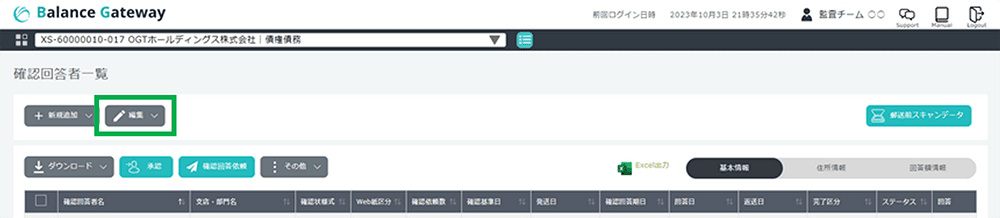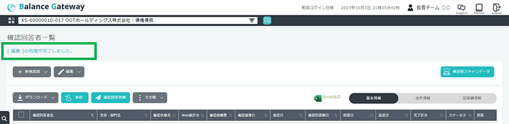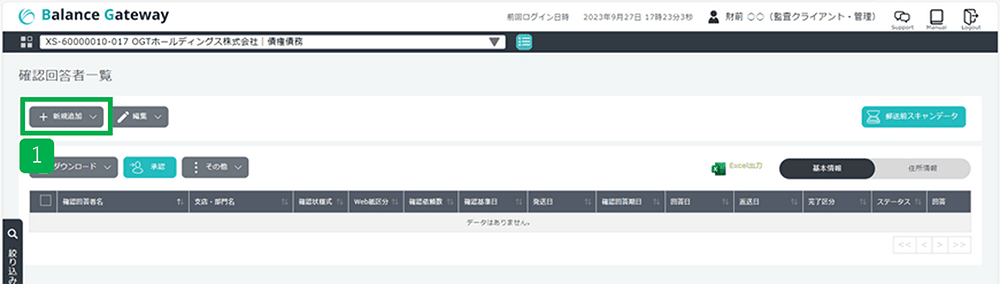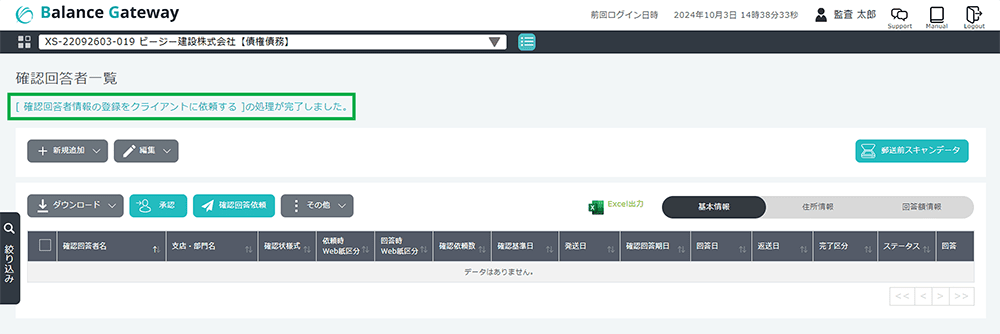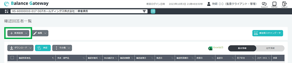 バージョンアップ以前は「確認回答者情報の追加」を実施してから「残高情報の登録」を実施していましたが、バージョンアップにより確認回答者情報追加用のExcelファイルの項目が変更となり、「確認回答者情報の追加」時に残高データも登録することが可能となります。項目の詳細はマニュアルを参照ください。