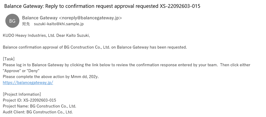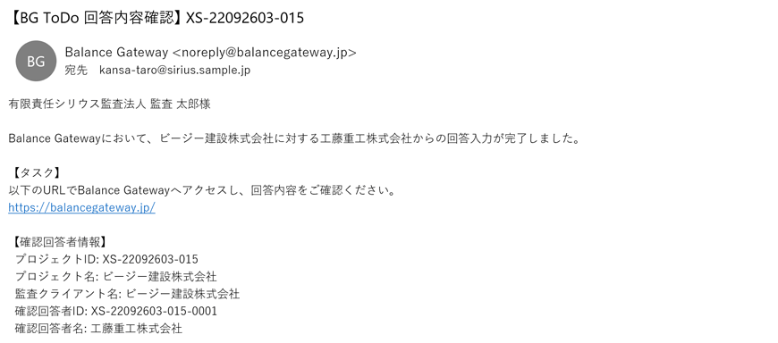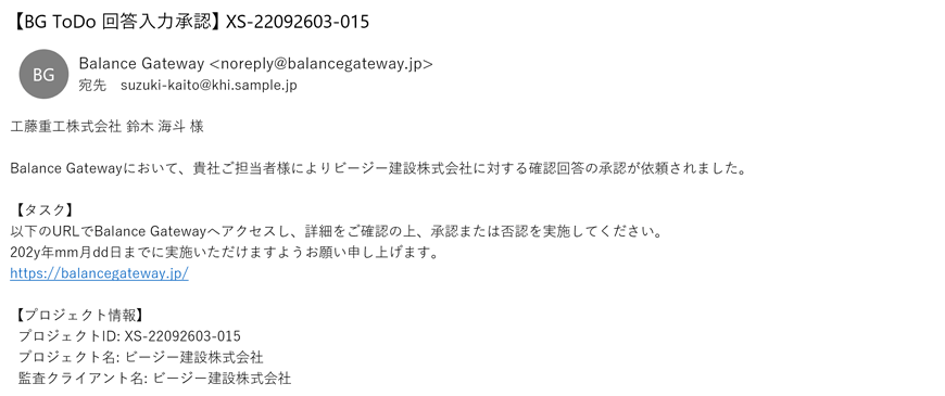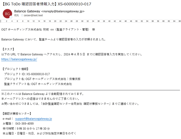 ご自身がユーザーに登録されたプロジェクトが作成または複製されるか、プロジェクトのユーザーに追加されると、その通知メールが送信されます。はじめてBalance Gatewayのユーザーに登録された場合、通知メールには初期パスワードが記載され、初回ログイン時に変更が必要です。