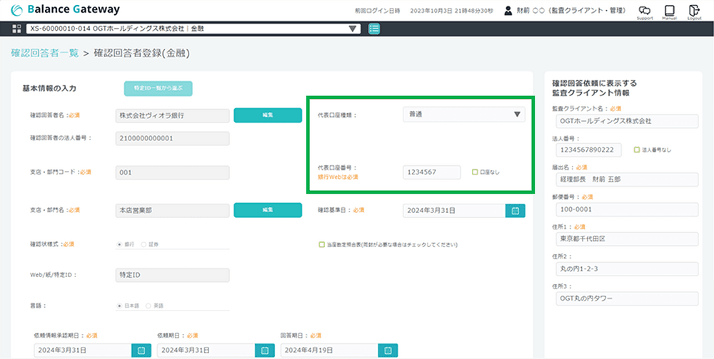 - プロジェクトタイプ「金融」における入力項目の「代表口座番号」について、「代表口座種類」と「代表口座番号」の2つに分けています。また、「代表口座種類」は選択形式の項目となっていますので、該当の口座種類を選択ください。