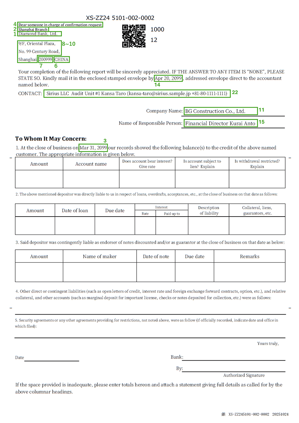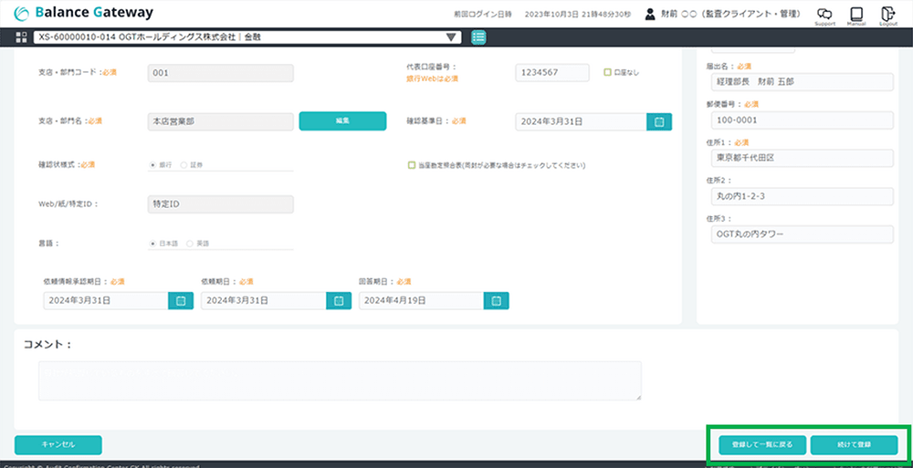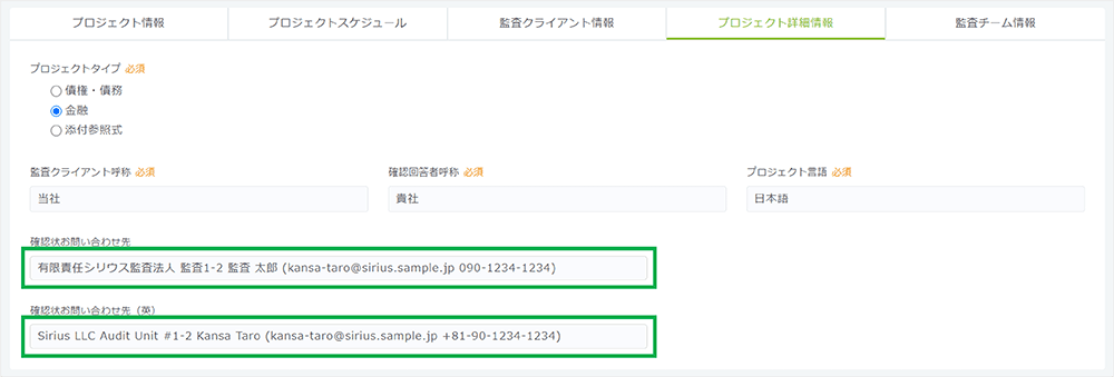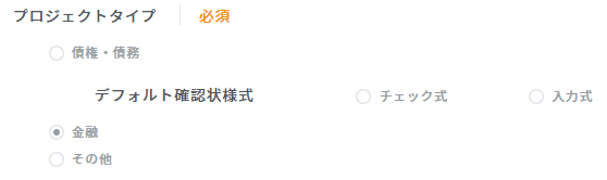 - プロジェクトタイプ「金融」において、「支店名」の項目を必須項目から任意項目に変更しました。なお、従前どおり「支店名」の項目に入力された項目は紙面の確認状に記載されませんので、「宛名」の項目に支店名を入力ください。
