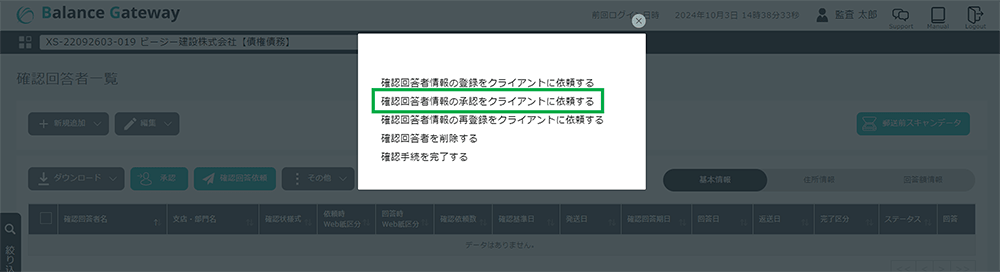 [確認回答者一覧]画面に[選択したものを監査クライアントへ承認依頼する(web)]ボタンが追加されており、Web確認時に当該ボタンをクリックすると被監査会社の管理者にメールが送付されるとともに被監査会社の管理者のタスクに「確認回答者情報入力承認」が追加されます。