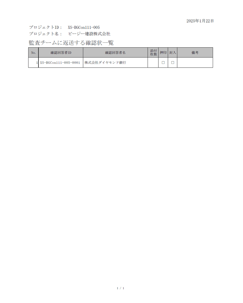 また、バージョンアップ時に「プロジェクトタイプB」にて登録済みの銀行確認状で、バージョンアップ後にプロジェクトタイプ「その他」に含まれている銀行確認状についても本紙を含む3枚のPDFが出力されます。