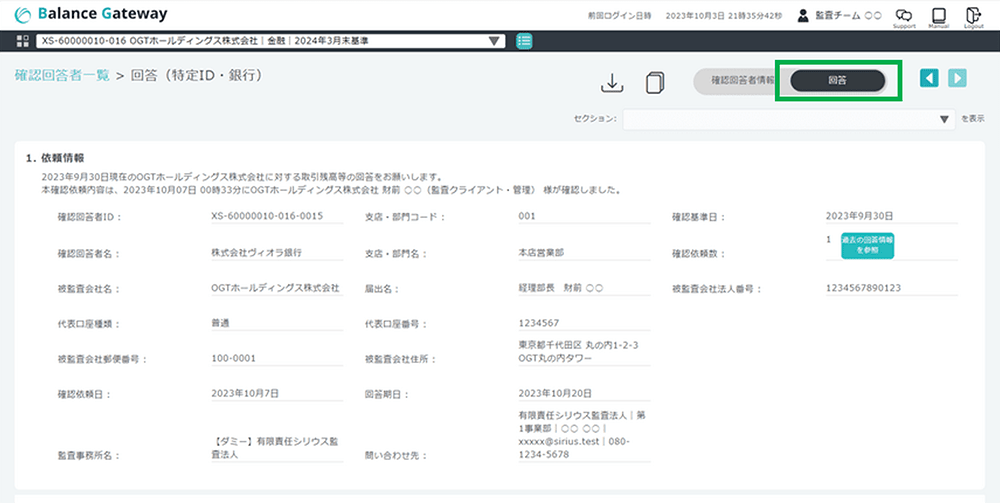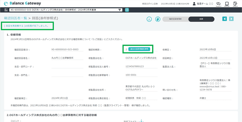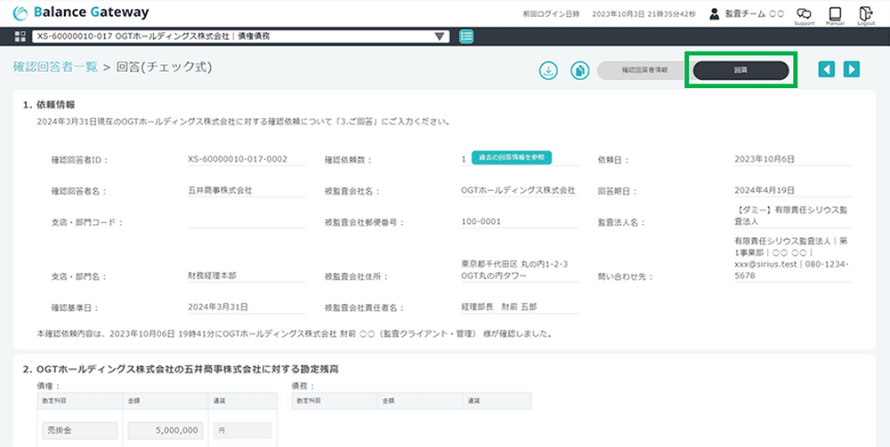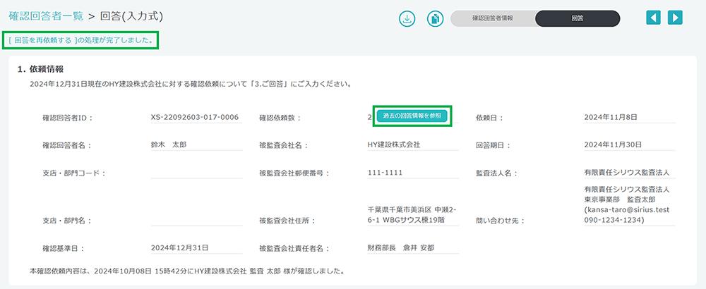 [確認回答者情報]画面に表示されている「この確認回答者情報を複写する」ボタンが追加されており、監査人ユーザーおよび被監査会社ユーザーは、既存の確認回答者情報をコピーして利用することが可能です。