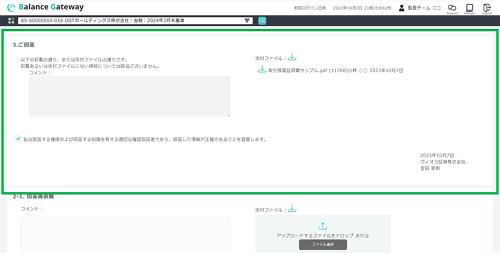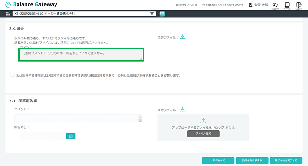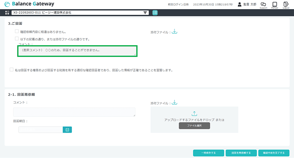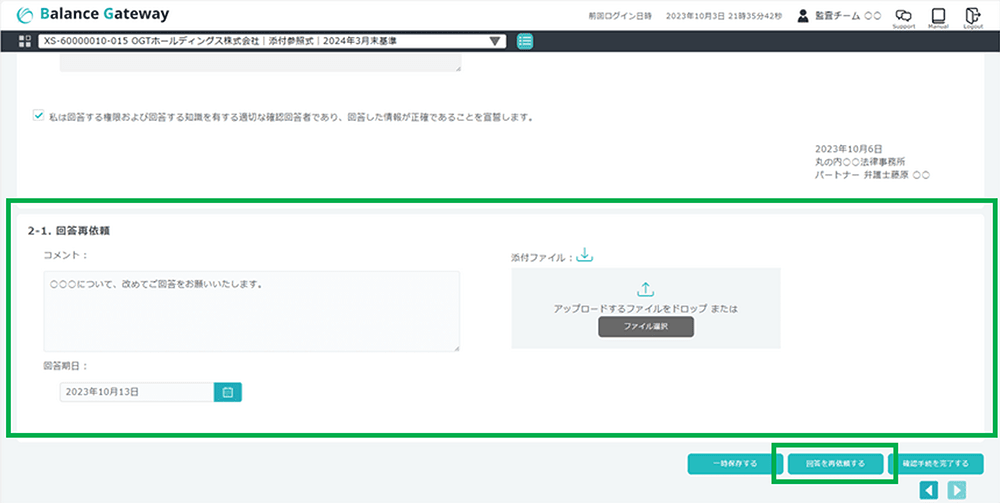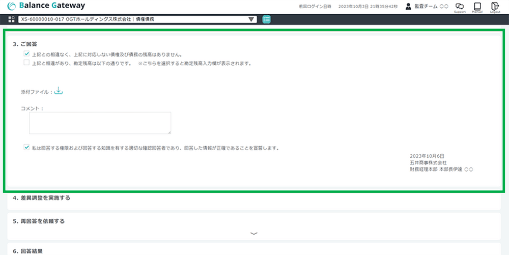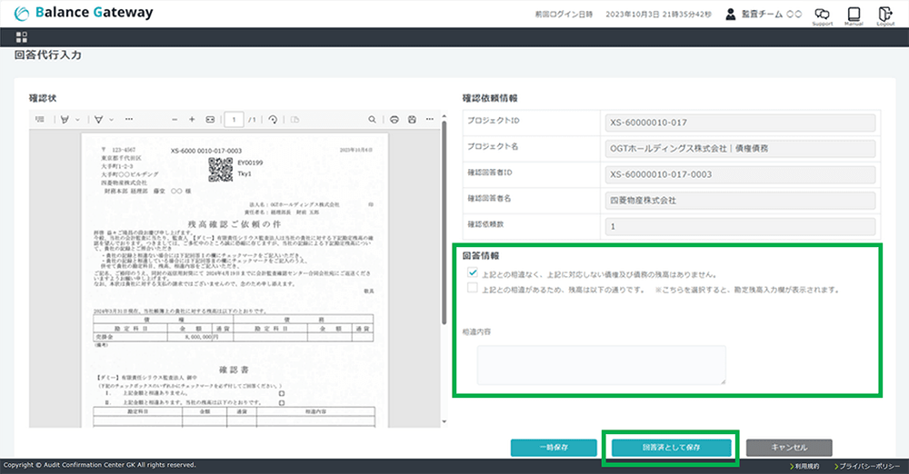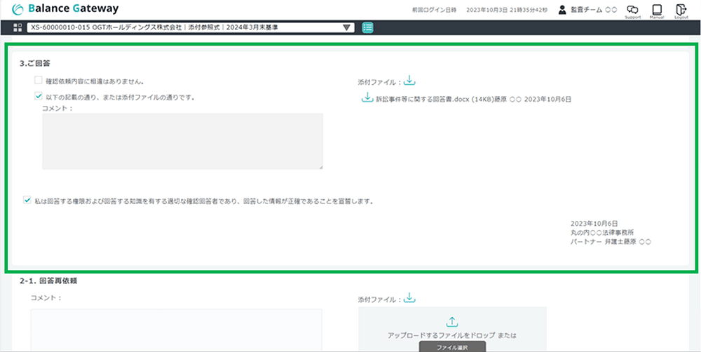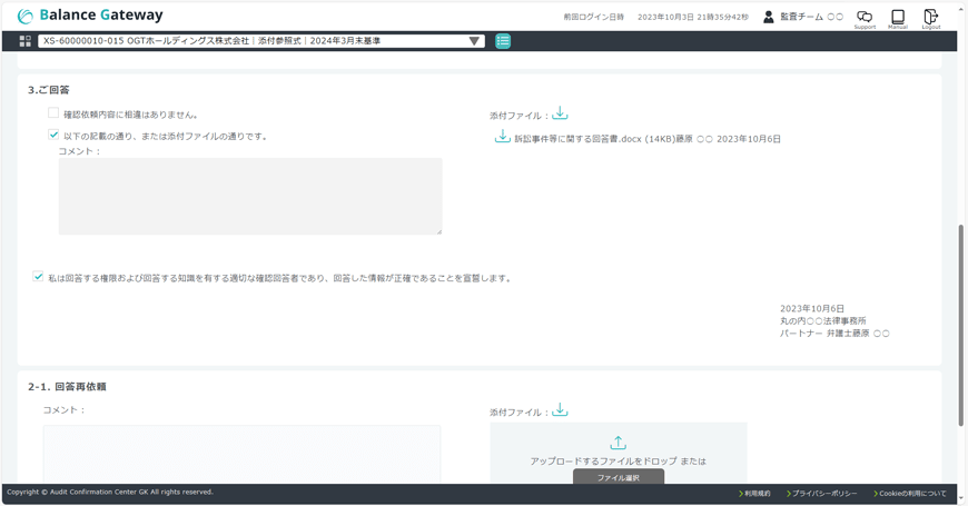 プロジェクトタイプ「債権・債務」(旧:プロジェクトタイプA)のチェック式の場合、バージョンアップ前は[回答]画面の[監査クライアント備考]欄にコメントを入力しても紙面確認状には反映されませんでしたが、バージョンアップによりコメントが紙面確認状に反映されます。