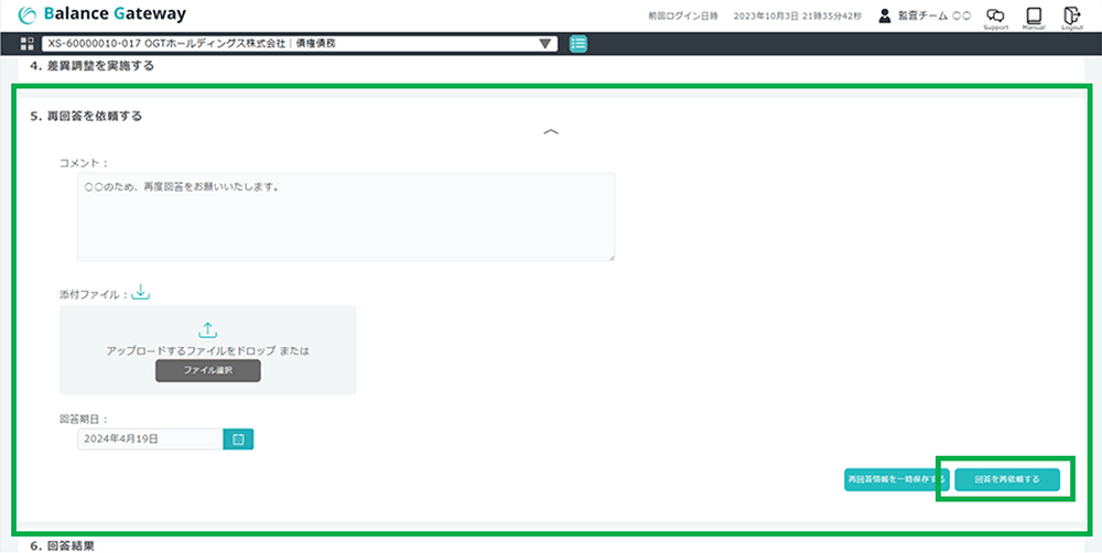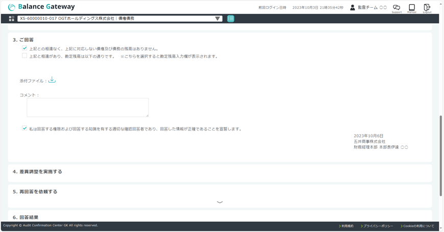 - プロジェクトタイプ「債権債務」における確認回答者ユーザーによる差異調整画面も利用状況を鑑み廃止しております。差異調整画面は監査人ユーザーおよび被監査会社ユーザーのみとなります。