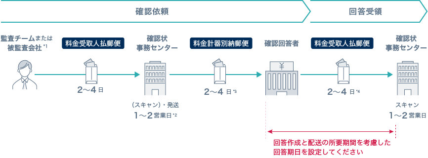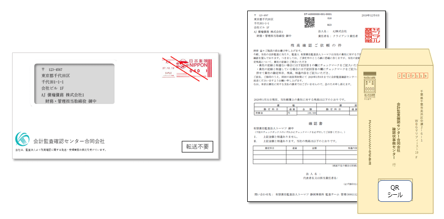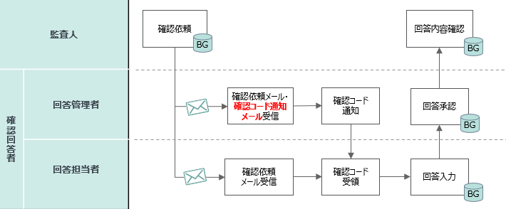 バージョンアップ前は監査人が確認依頼を行うと、確認状事務センターから確認依頼書の紙面が発送されていましたが、バージョンアップにより監査人が確認依頼を行うと、確認回答者が初回認証を行う際に必要な確認コードが確認回答者の管理者へメールで送付されるようになりました。また、この変更に伴い、確認依頼書の発送は廃止しています。