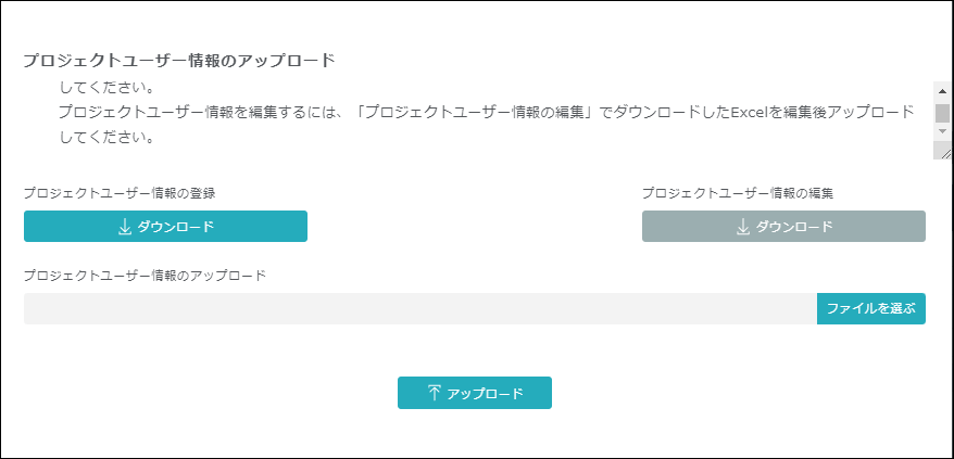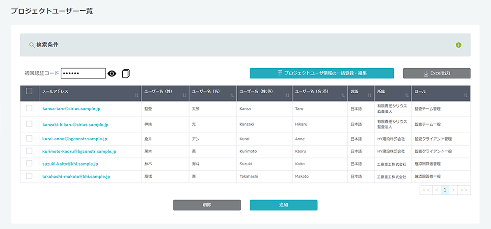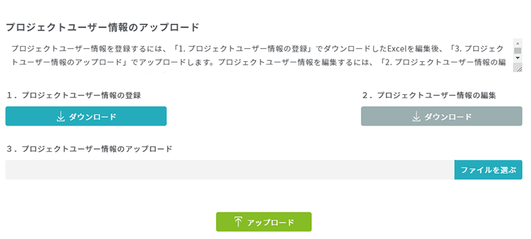 プロジェクトユーザー一覧画面に[プロジェクトユーザー情報の一括登録・編集]ボタンが追加されており、監査人ユーザーおよび被監査会社ユーザーはテンプレートをダウンロードして更新し、アップロードすることで、ユーザーを一括追加または編集することが可能です。