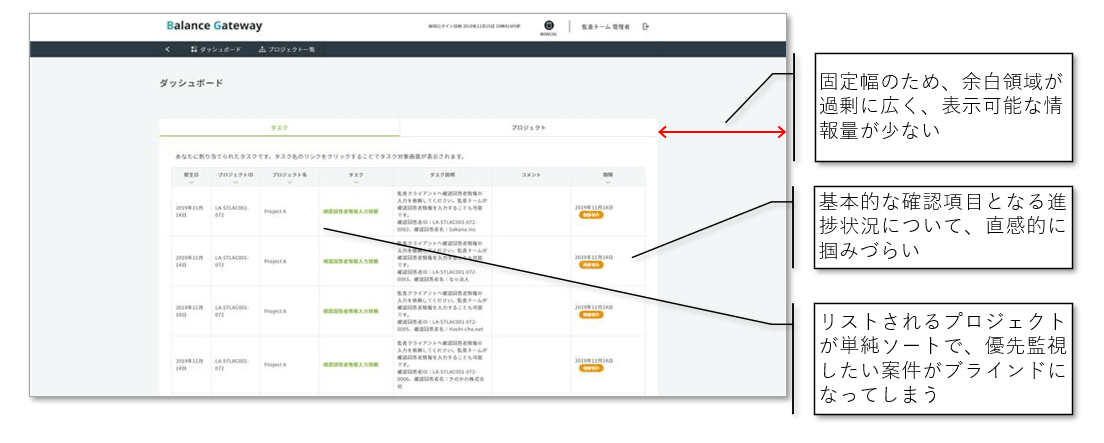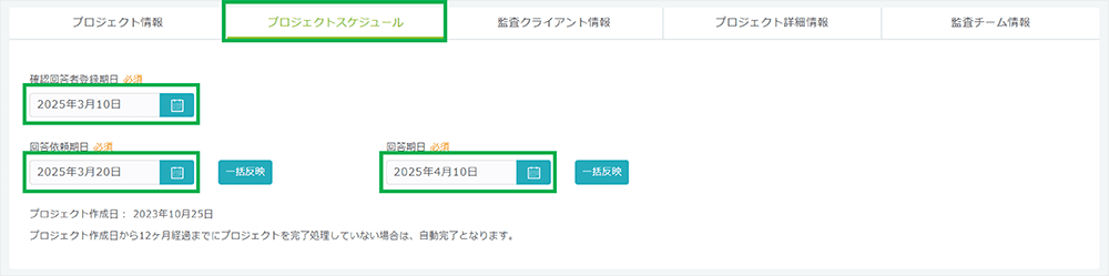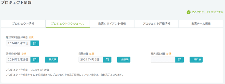 - プロジェクトタイプ「金融」および「その他」を選択した場合、プロジェクトスケジュールの「残高データ登録期日」および「残高データ確定期日」の項目を非表示に変更しました。