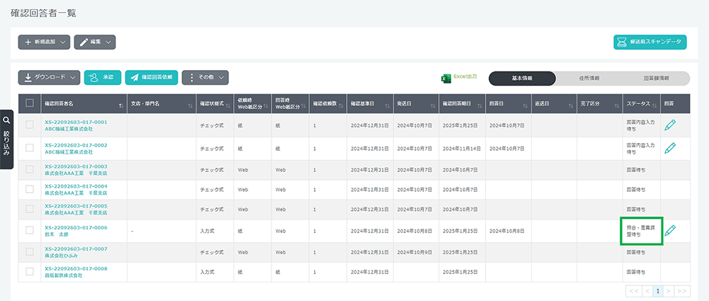 - [確認回答者一覧]画面において、[回答内容確認待ち]ステータスの絞り込み検索が可能となりました。