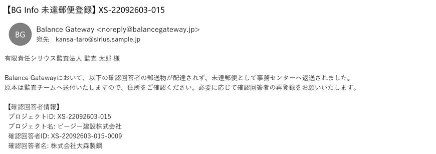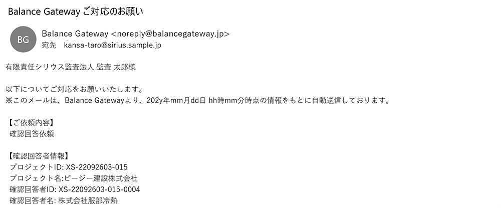 弊社は確認回答者のメールアドレスの妥当性の検証は実施しておりません。メールアドレスの妥当性の検証は監査手続となりますので、手続の要否および実施する手続の内容に関しては監査人がご判断ください。